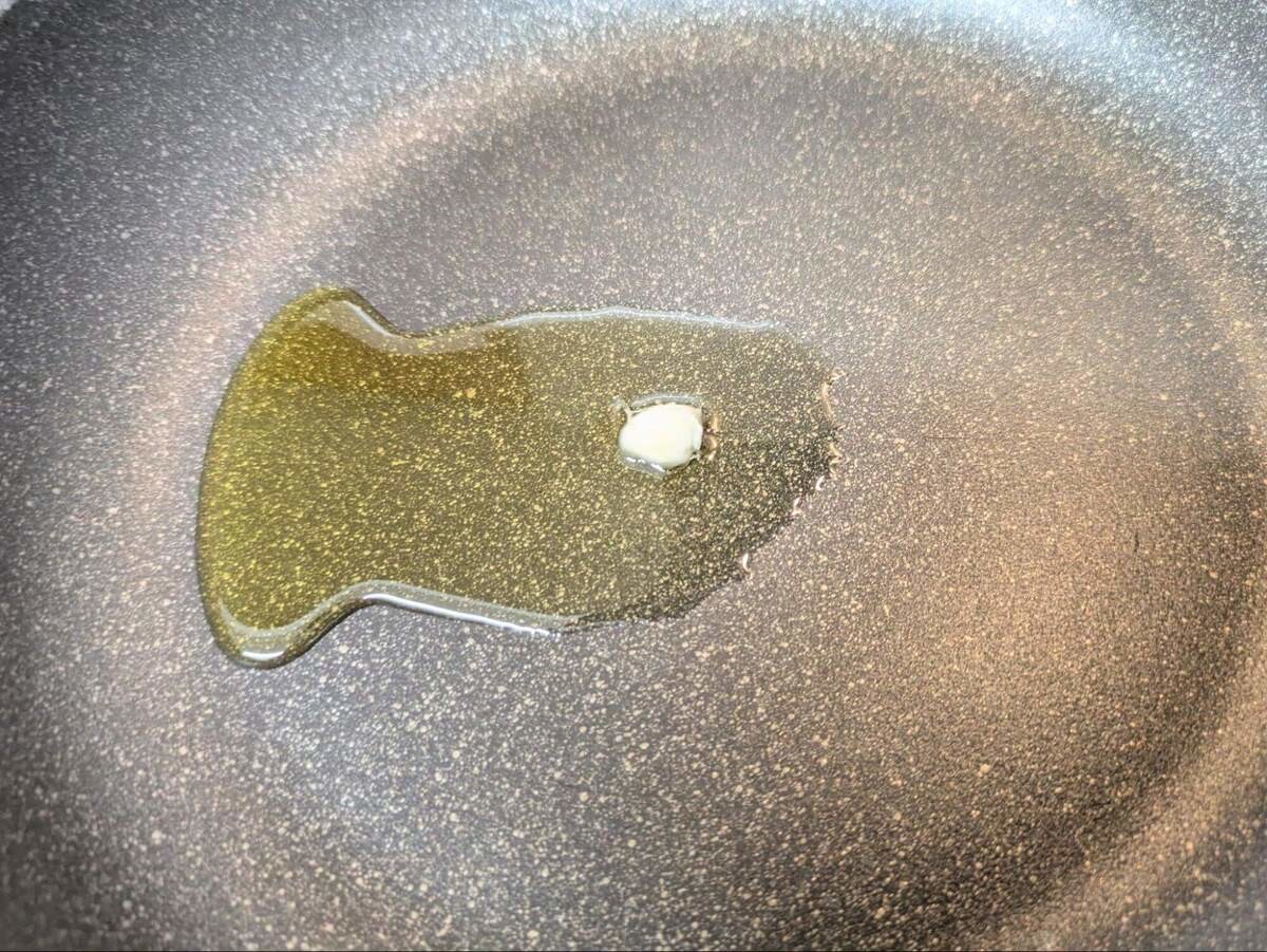 深めのフライパンにオリーブ油と①で取っておいたにんにくのカケラを入れ、弱火にかけます。