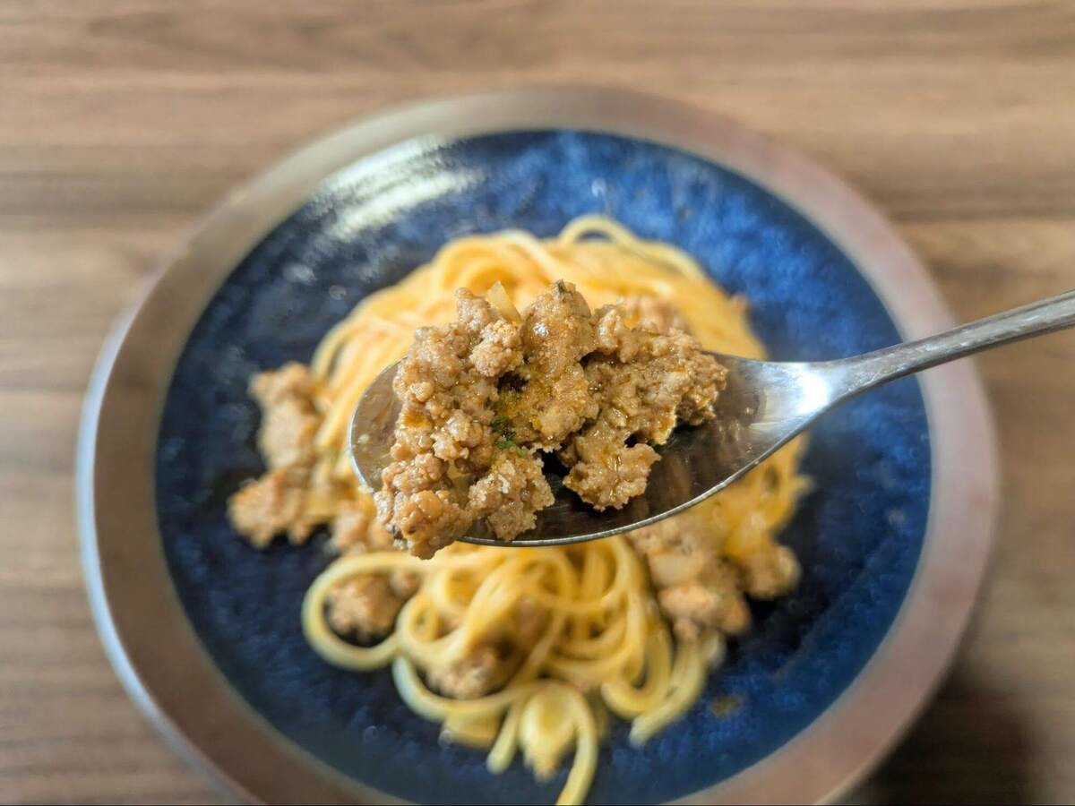 普段、ミートソースはレトルトに頼りがちで自分で作ることはあまりないのですが、手作りだとお肉の量が違いますね!たっぷりのお肉に贅沢な気持ちになりました。