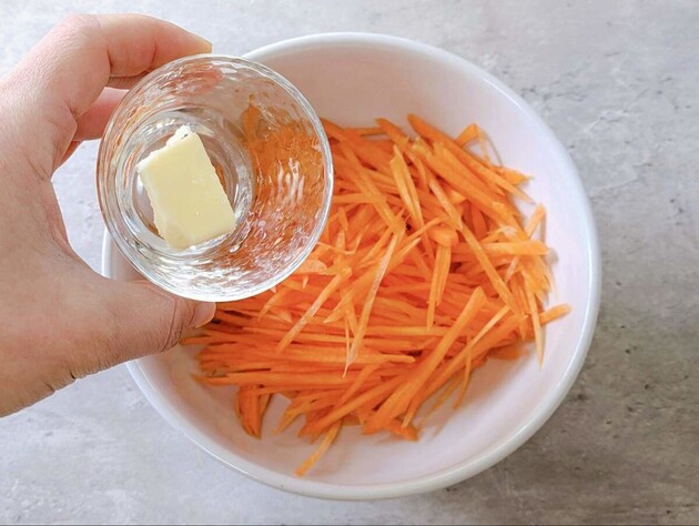 耐熱ボウルに入れてバターを加え、ふんわりとラップをして600Wの電子レンジで2分間加熱します。