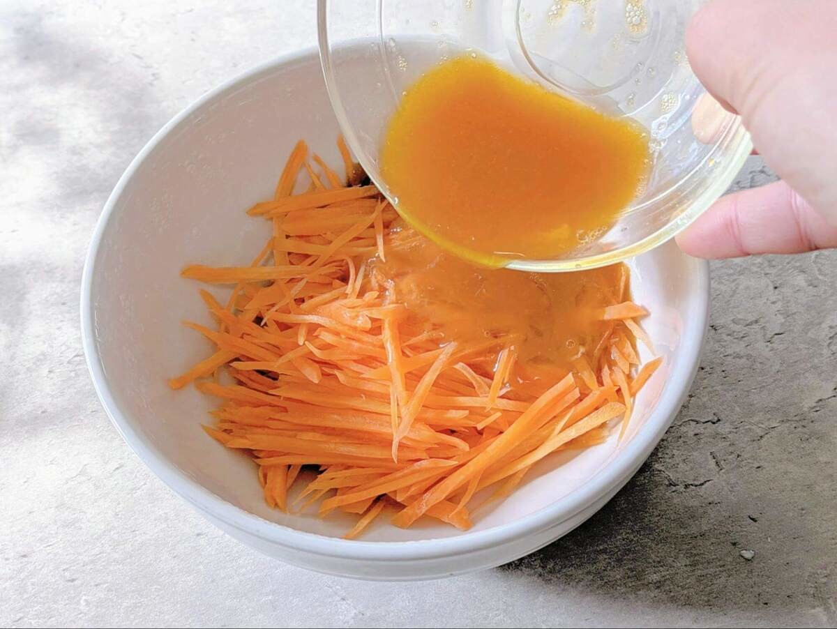 作り方①にんじんをせん切りにして電子レンジで加熱する