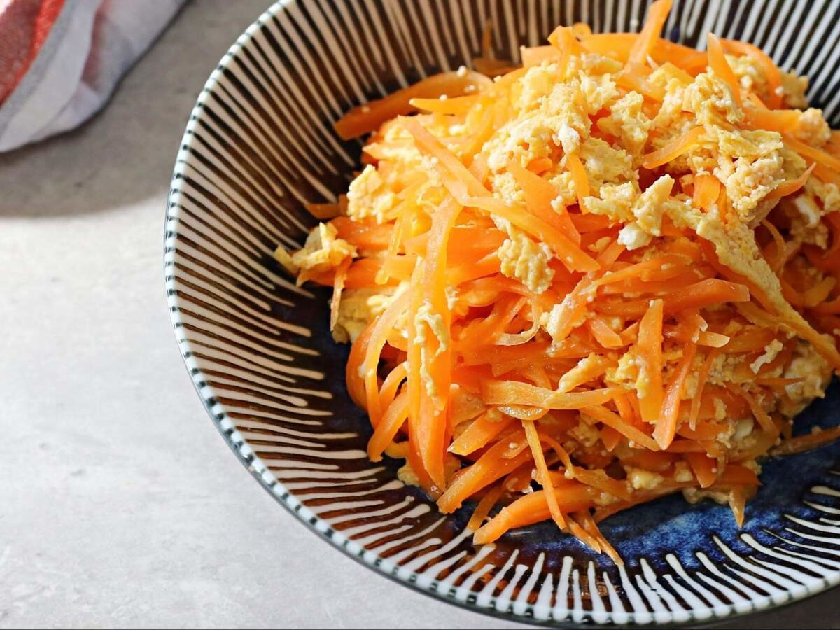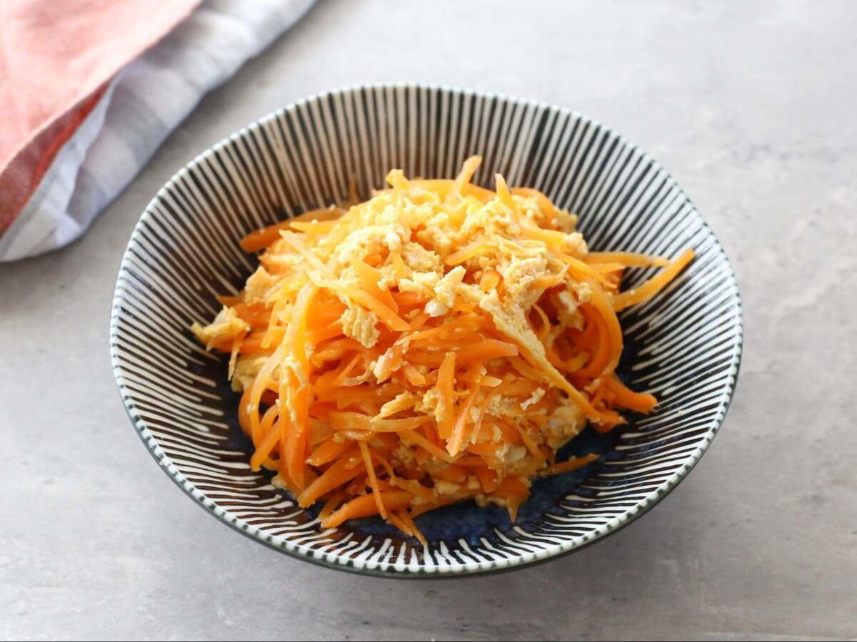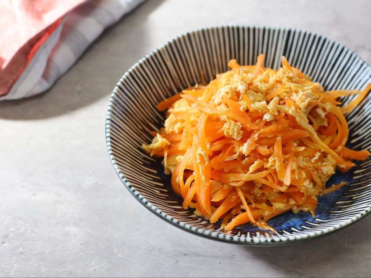 にんじんのオレンジと卵の黄色で彩り鮮やか!茶色いおかずばかりのときに作れば、食卓がパッと明るくなりそうです。