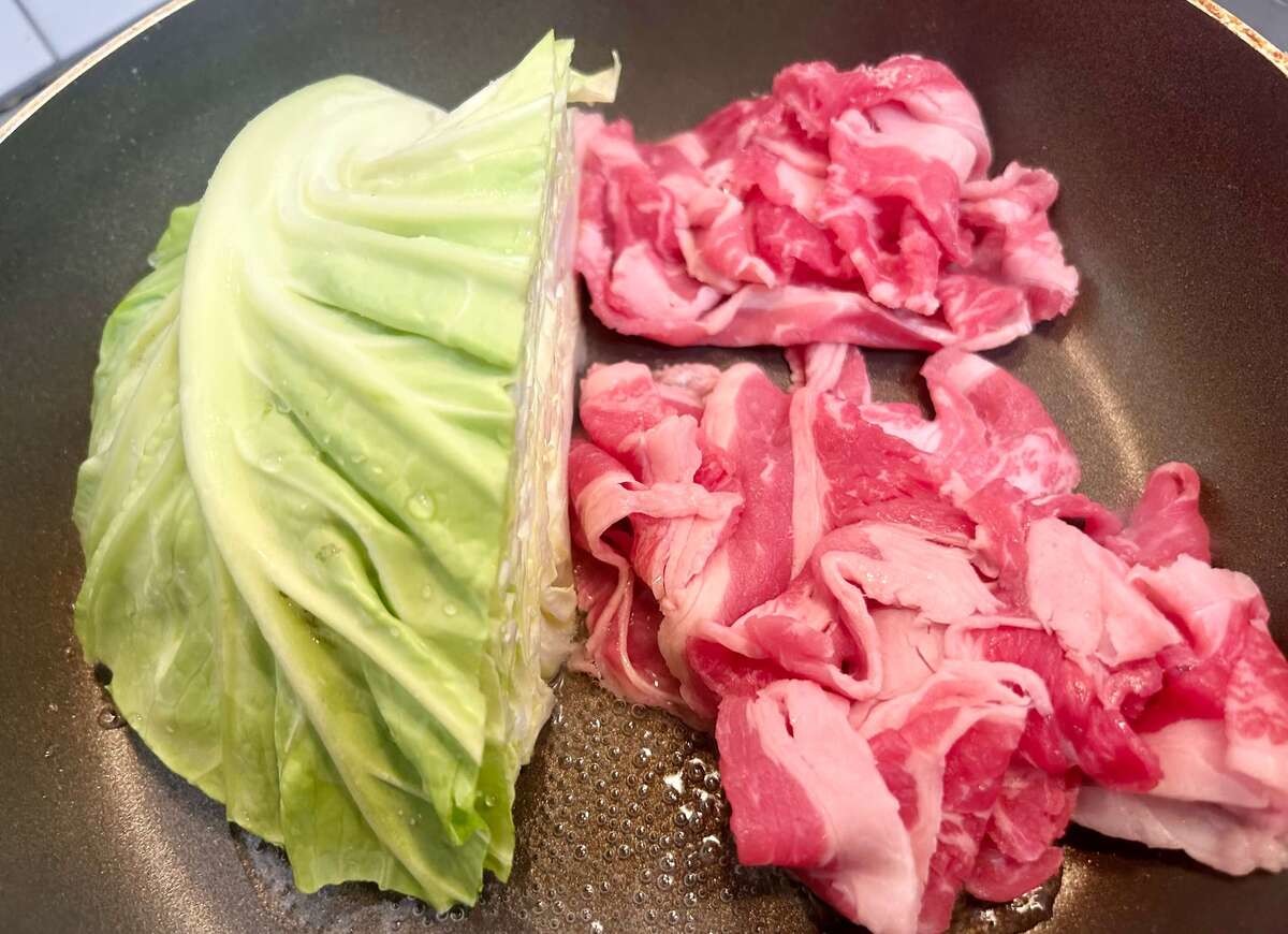 鍋に油を入れて中〜強火で熱したら、キャベツと牛肉を投入します。