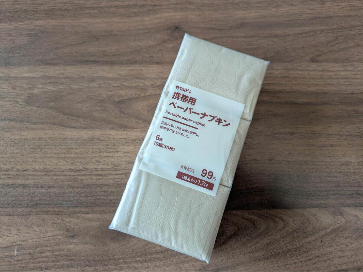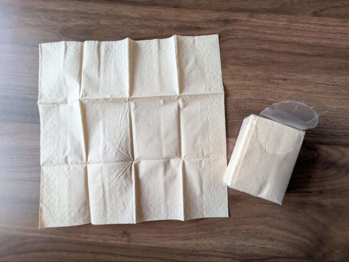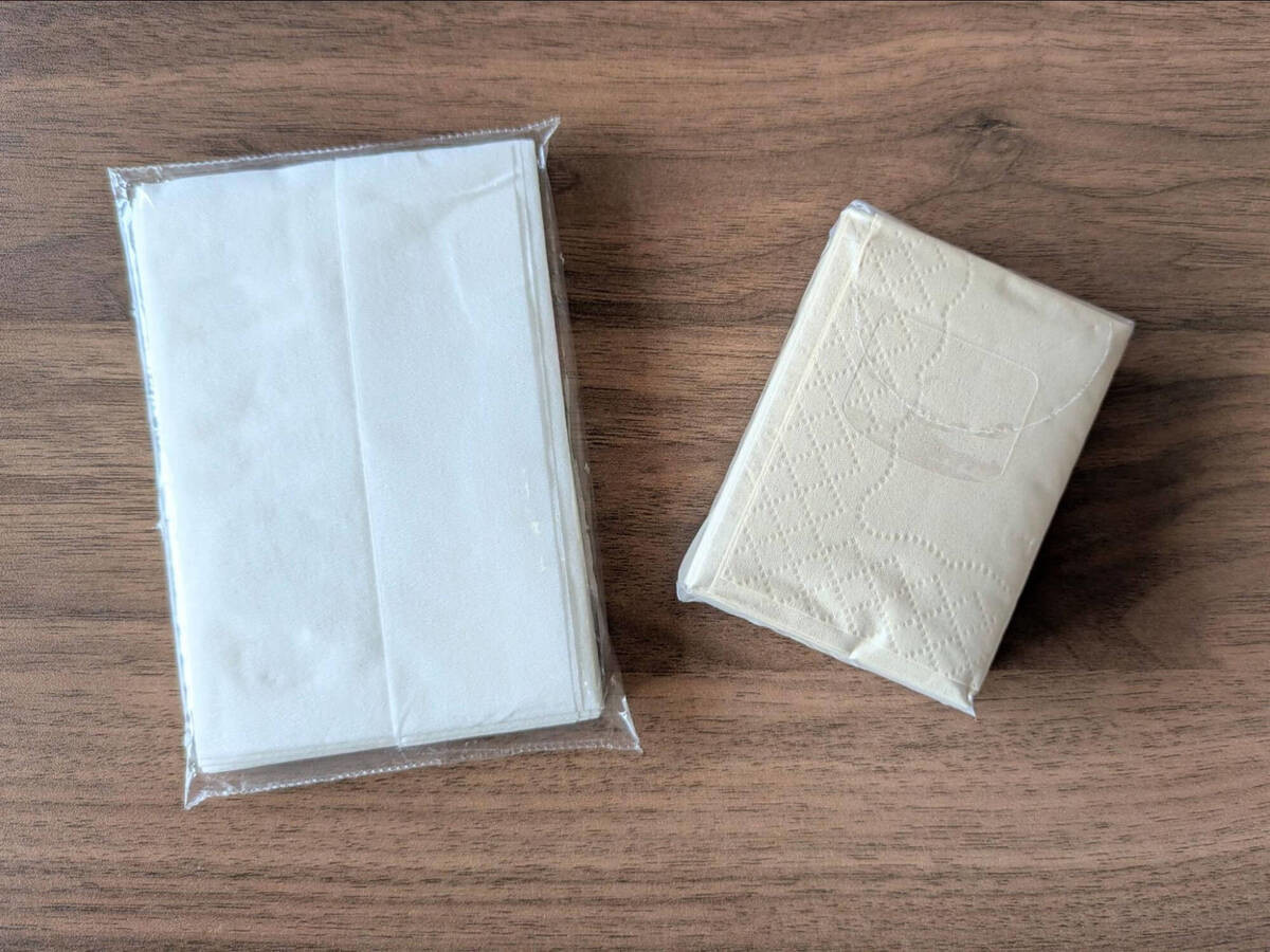 写真左側はお店でいただいたポケットティッシュで、右側が無印良品のペーパーナプキンです。