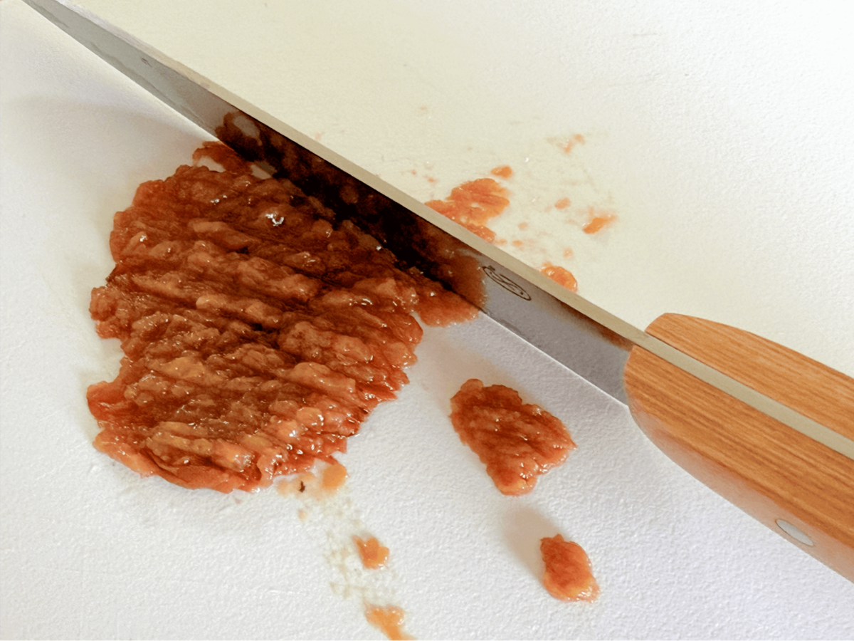 梅干しは種を取り、身を包丁で細かくたたいてボウルに入れ、【梅みそソース】の残りの材料を加えて混ぜ合わせます。