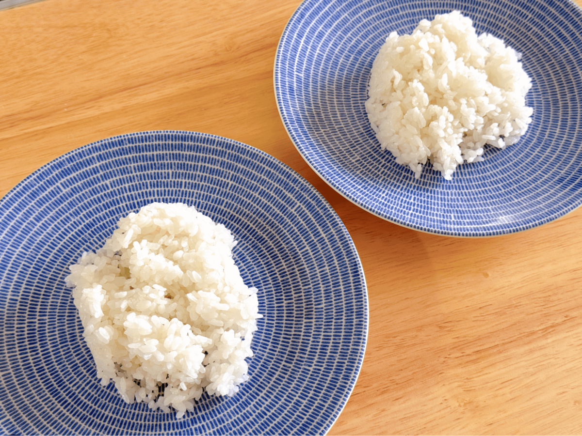 ご飯を、2枚のお皿にそれぞれ盛ります。空気を含ませるようにふんわりと丸く盛ると、卵やソースとバランスが良くなりますよ!