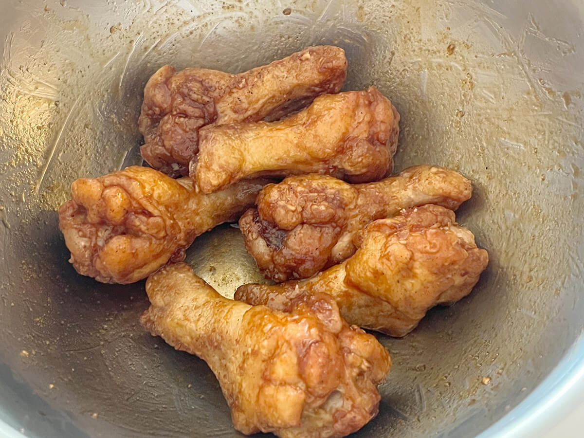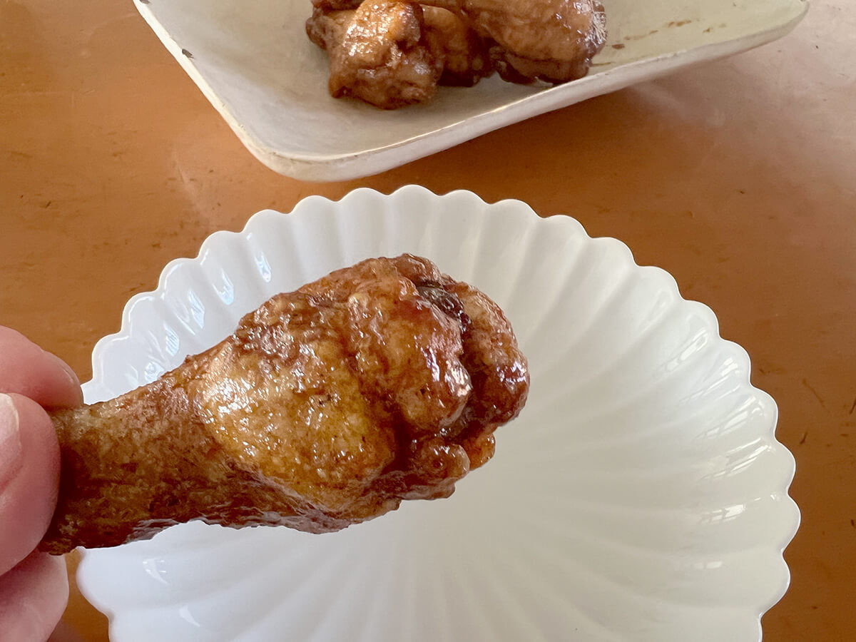そういえば、手羽元は煮ることが多かったなと気付きました。唐揚げにする場合は、揚げる前に下味をつけることがほとんどで、こんな風に後から味をからめるというのも新鮮な手法でした。