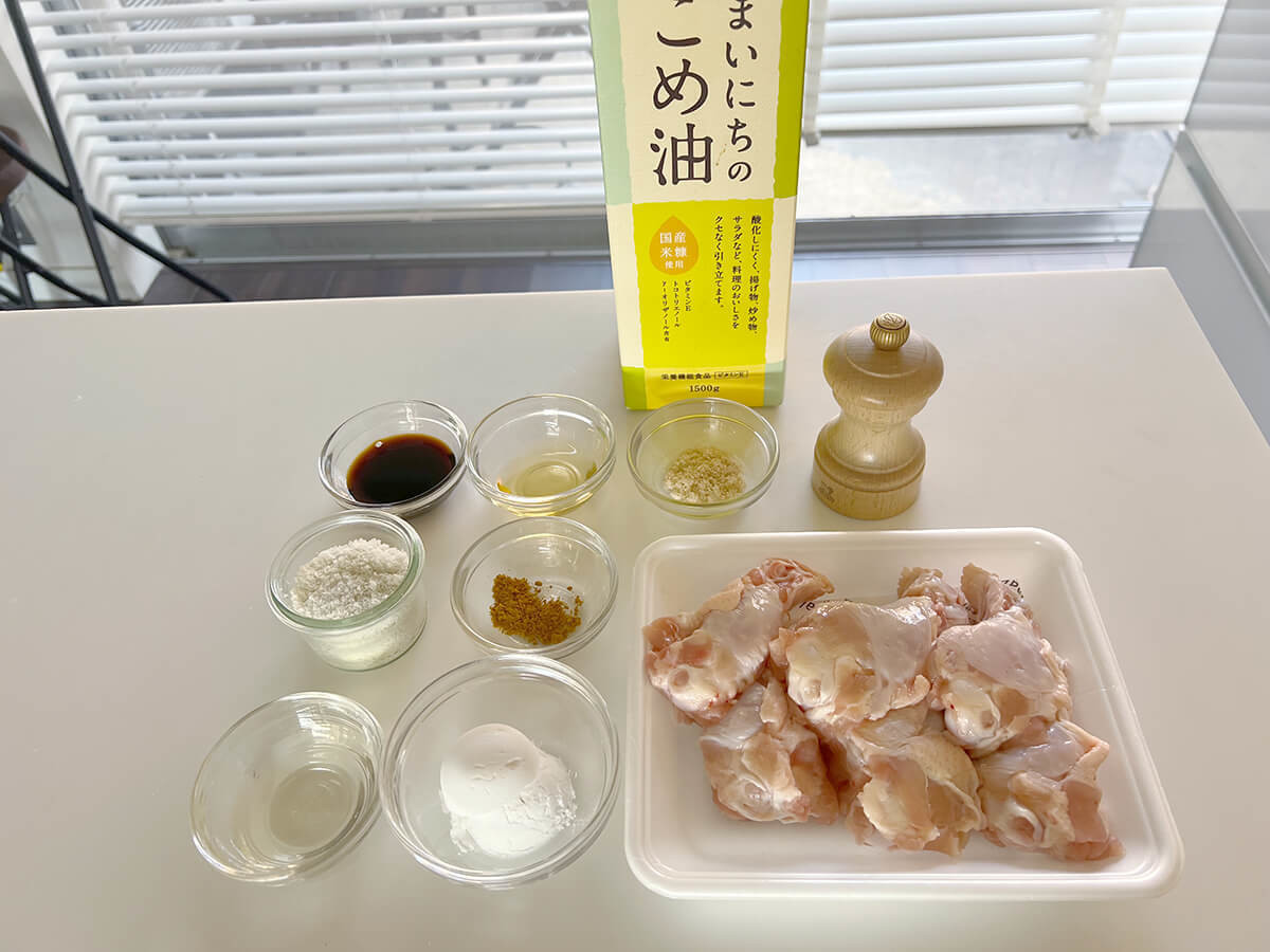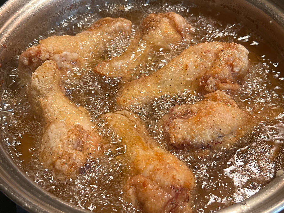 フライパンに米油(またはサラダ油)を1cm程度入れ、鶏肉を弱めの中火で12〜13分程返しながら、揚げ焼きにしましょう。