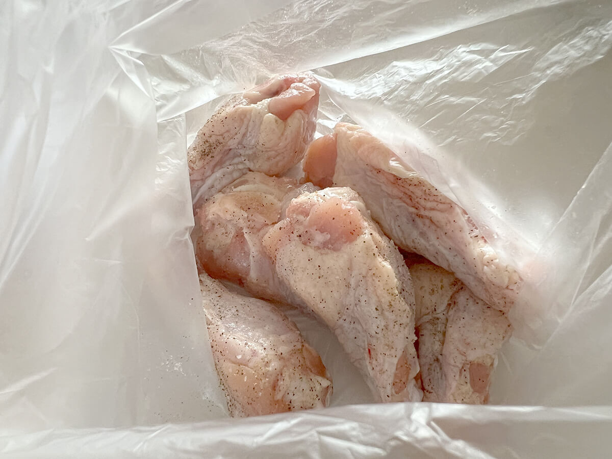 ポリ袋に入れ、塩・こしょうと酒を揉み込みましょう。