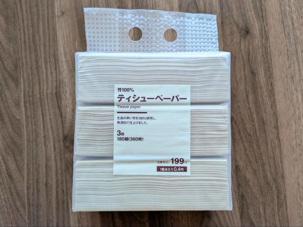 無印良品の竹で作られたポケットティシューやペーパーナプキンは、ややかためで丈夫さがポイントですが、この卓上用ティシューペーパーは、肌当たりがやわらかい。