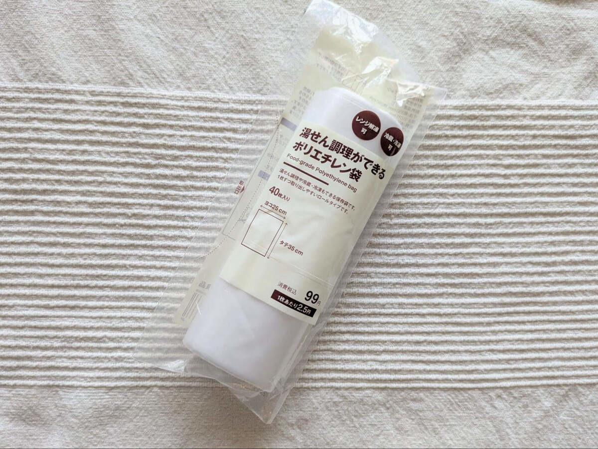 今まで冷凍対応のチャック付きの袋を使っていましたが、無印良品のポリエチレン袋の方が手に取りやすい値段で湯せんまでできるので重宝中です。