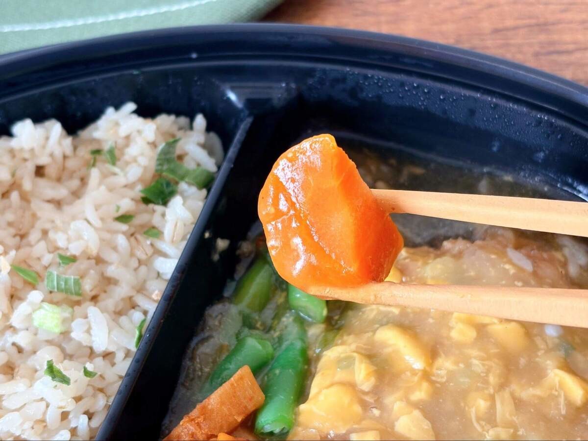 温めてフタを開けると、とろっとした卵とじがたっぷりのったかつが登場。ひと口食べてみるとやわらかく、歯切れのよい食感に驚きました。