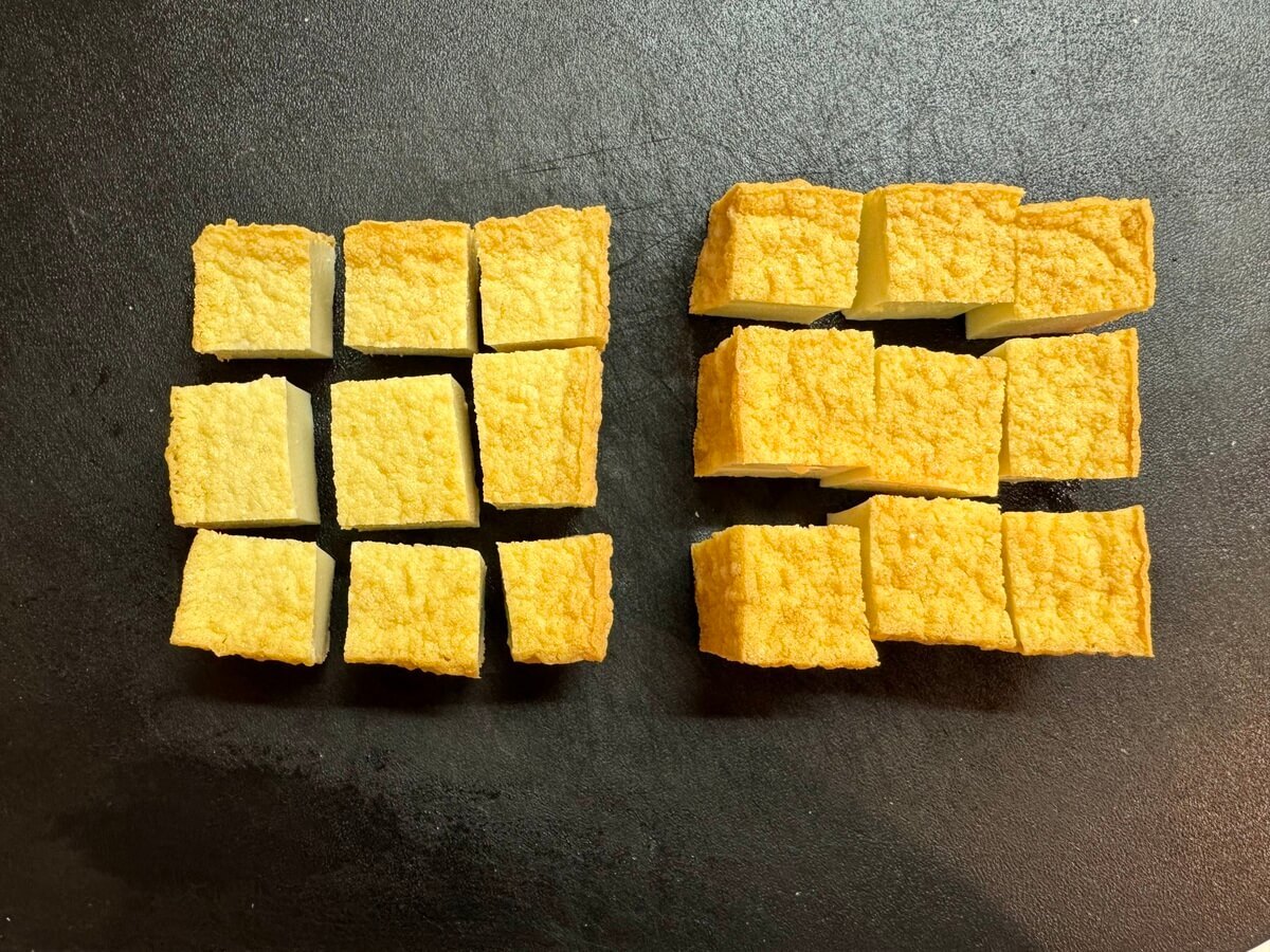 今回は厚揚げ1枚を9等分に。小さいサイズの角切り厚揚げが18個できました。