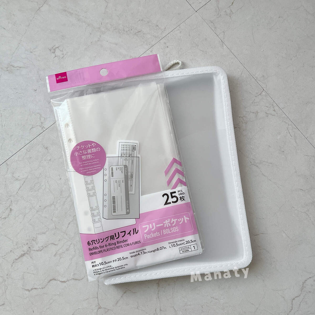 私もずっと探していたところ、セリアの店員さんから「ダイソーのファイルに合いますよ!」とこっそり教えてもらい、試してみたら本当にジャストサイズ。