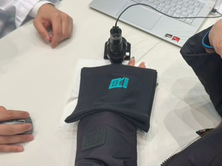 とはいえ、「本当に着るだけでそんな効果があるの?」と疑問ですよね。その効果を体験できる血流測定ブースで、手の甲にメディヒールと同じ布を被せ、爪の付け根の血流のビフォーアフターを見てもらいました。