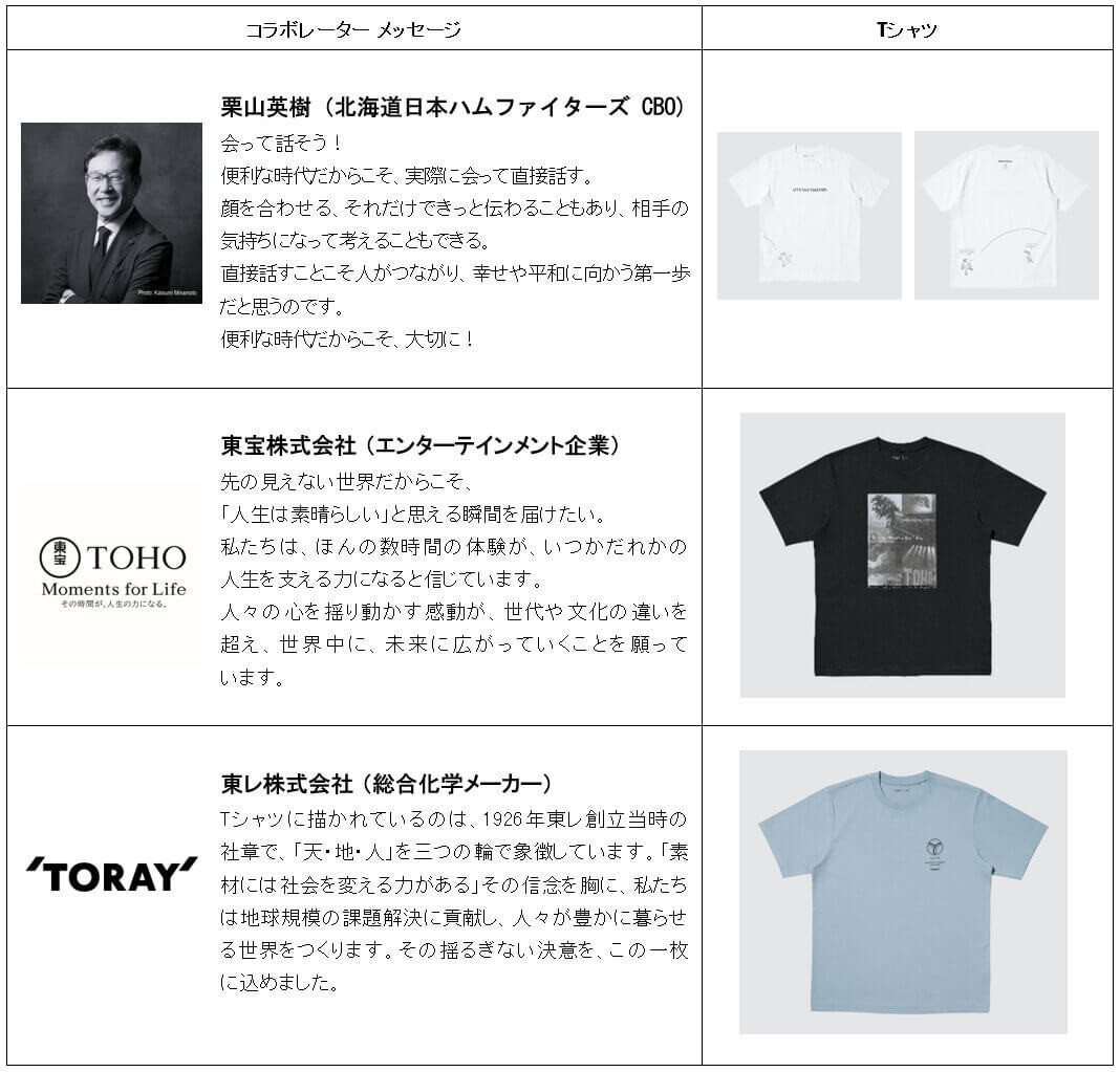 今回、新たなコラボレーターに、2023年に野球日本代表「侍ジャパン」を率いて世界一に導き、2026年に野球殿堂入りした栗山英樹氏、映画・演劇・アニメをグローバルに展開する日本を代表するエンターテインメント企業 東宝株式会社、ユニクロと戦略的パートナーシップを結ぶ、素材の力で社会課題の解決に挑み続けてきた総合化学メーカー 東レ株式会社の3組が加わり、平和への願いを込めてデザインしたTシャツ全3柄が登場します。