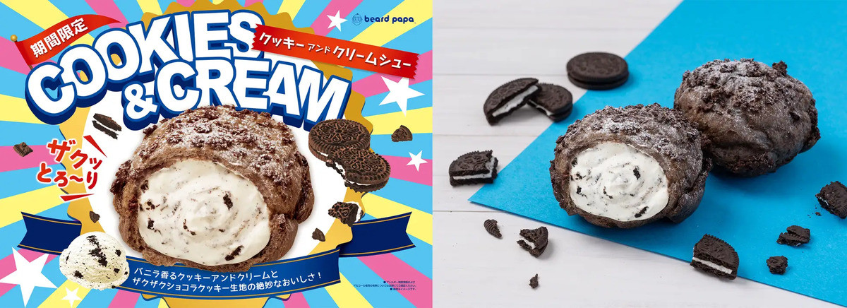 バニラ香るやさしい甘さのクッキーアンドクリームと、ほろ苦いショコラクッキー生地が絶妙なバランスの“クッキーアンドクリームシュー”は、ザクザク食感となめらかなクリームのコントラストが楽しめる期間限定フレーバーとして、10年以上にわたり多くのお客様から愛され続けている人気のシュークリームです。