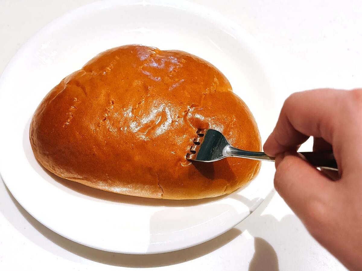 ちなみに、クリームパンの表面はつるつるしていて、このあと思っていた以上に卵液が染み込みませんでした。穴は気持ち多めにあけておくことをおすすめします!