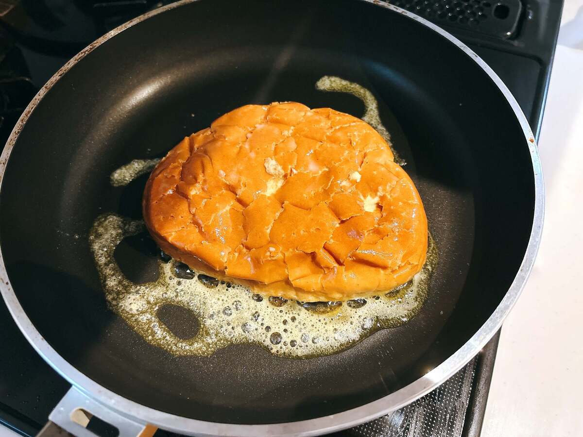 バターを置いたらフライパンを熱し、バターが溶けたところで卵液に浸したクリームパンを置きます。