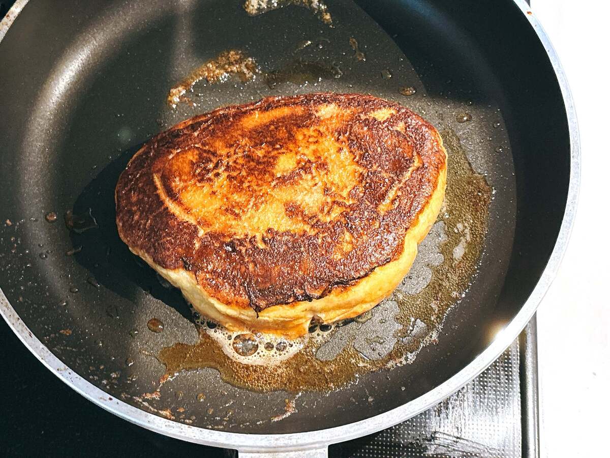 両面に焼き色がつくまで、こんがりと焼きます。片面2分ずつ焼いたら、いい感じの焼き色がつきました。