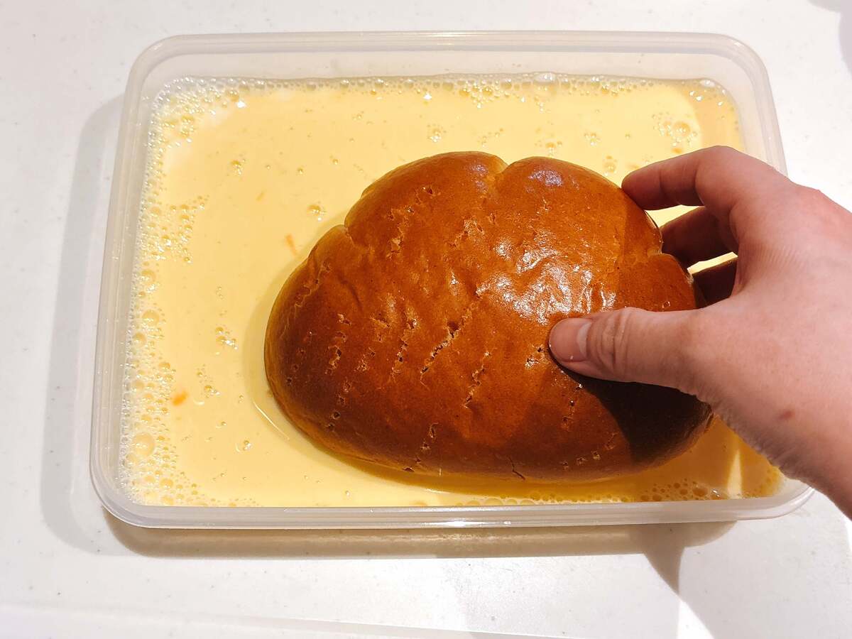 ここに、クリームパンをドボン!卵液にしっかりと浸します。