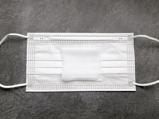 もう1枚のガーゼを4つ折にして市販の不織布マスクの内側に置きます。