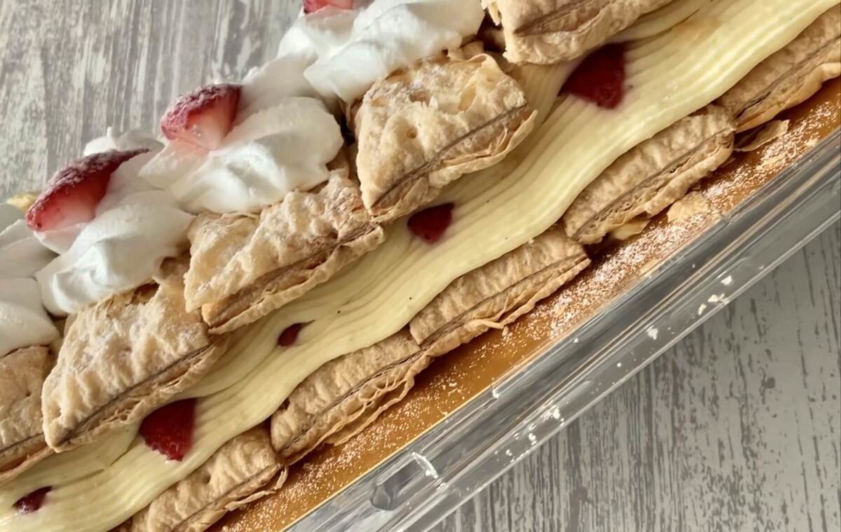切り分けやすいように、あらかじめカットされたパイで、たっぷりのカスタードクリームを挟んでいます。ミルフィーユはカットするとボロボロになってしまいがちなので、嬉しい工夫ですね。