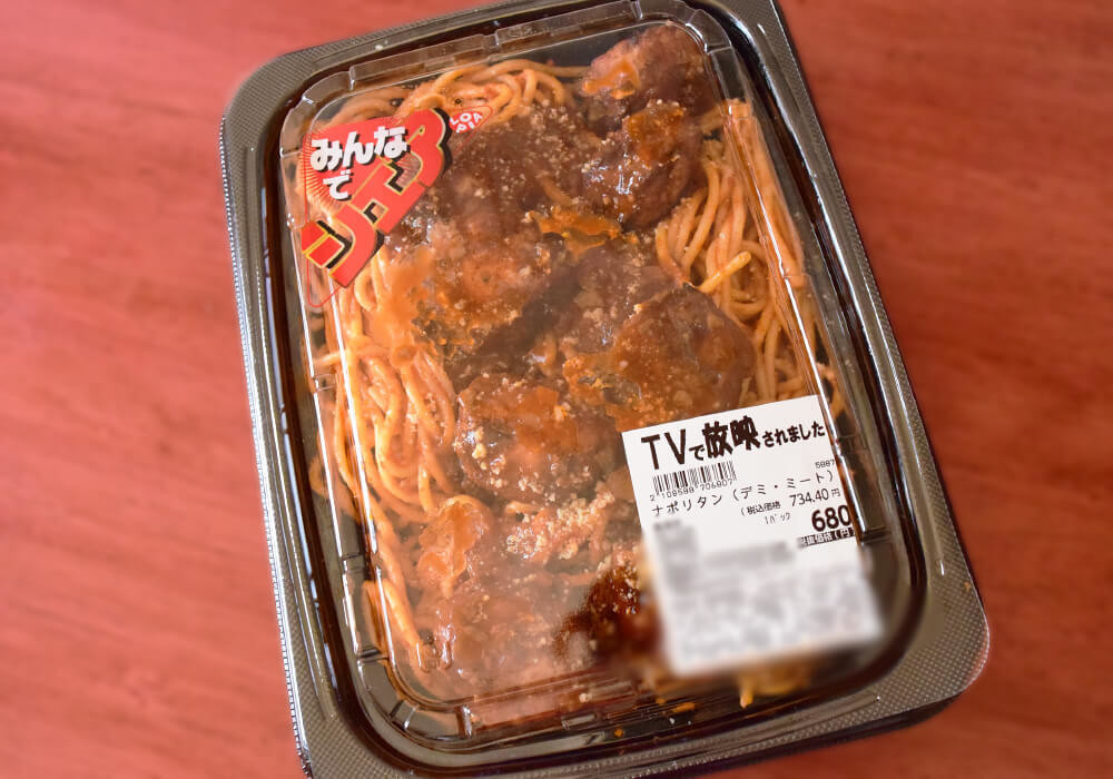 番組内では「デカい総菜」として紹介されていた「ナポリタン(デミ・ミート)」。「みんなでシェア」といった表記がある通り、その名の通り圧倒的なボリューム感が印象的でした。ボリューム重視の総菜であることは、間違いなさそうです。