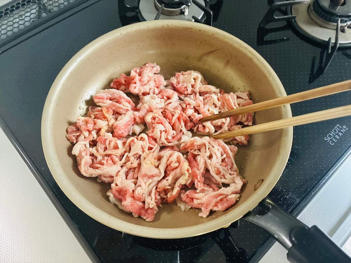 フライパンに米油を熱し、牛バラ肉を中火で炒めます。