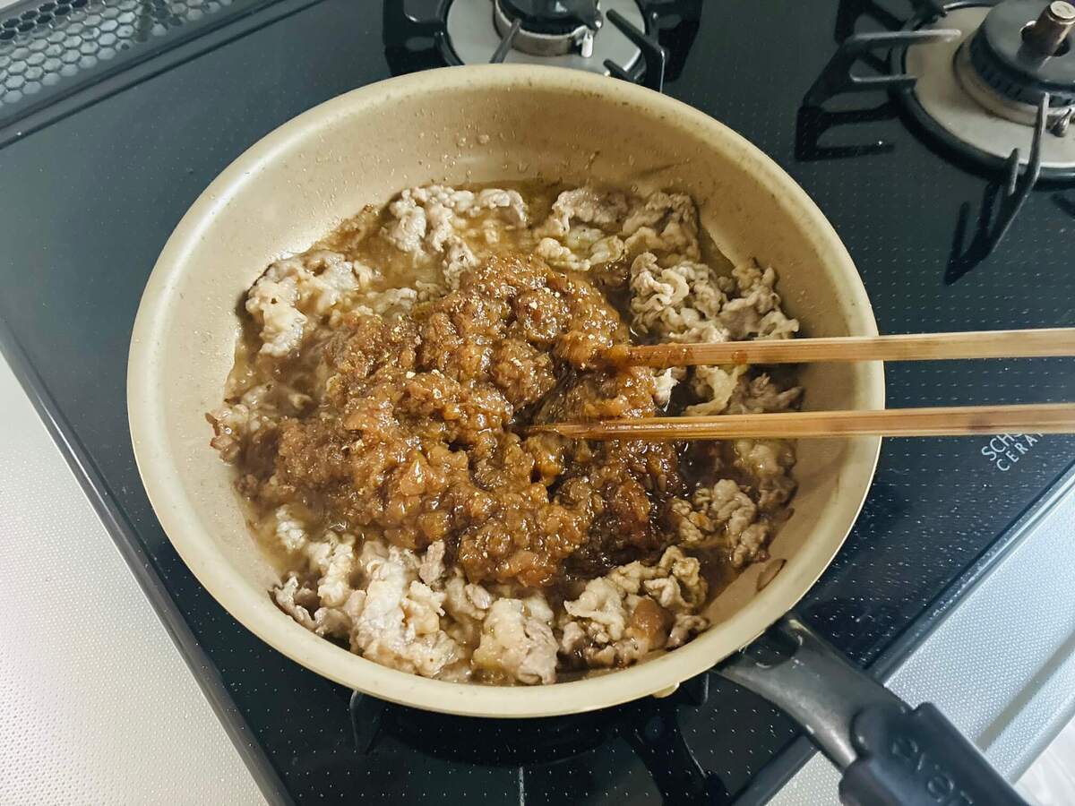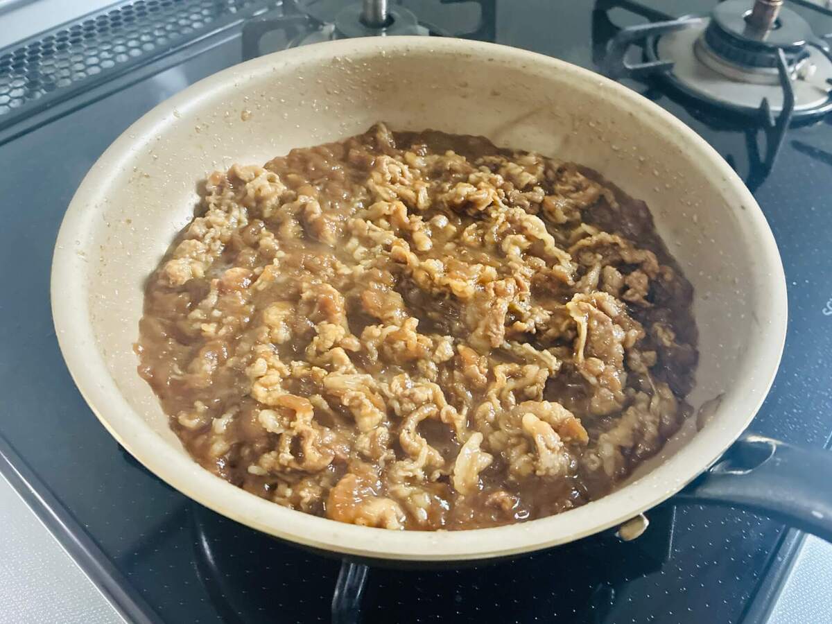 作り方③牛バラ薄切り肉と炒め玉ねぎをフライパンで炒める