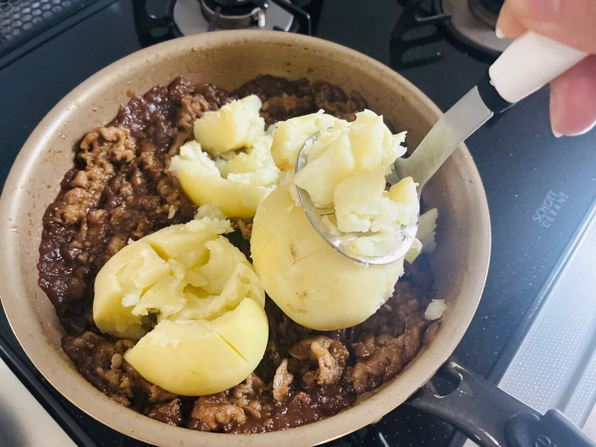 じゃがいもに汁を吸わせるように潰しながら混ぜます。