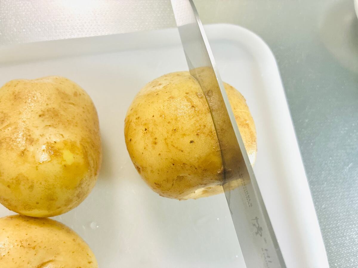 じゃがいもは皮ごとよく洗い、包丁で十字に切り込みを入れます。