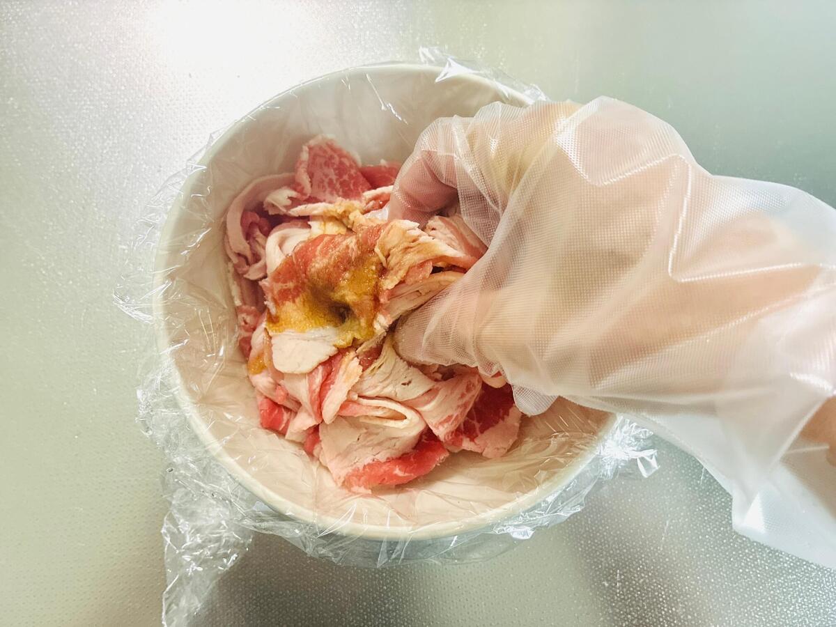 牛バラ薄切り肉に【A】を加え、もみ込みます。