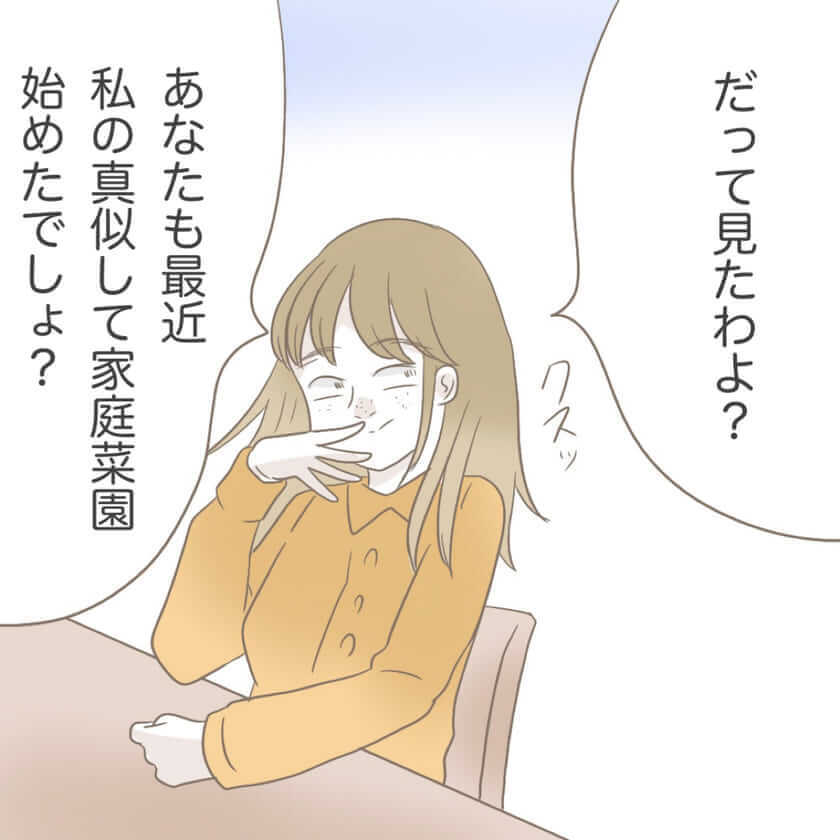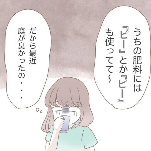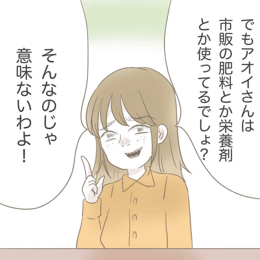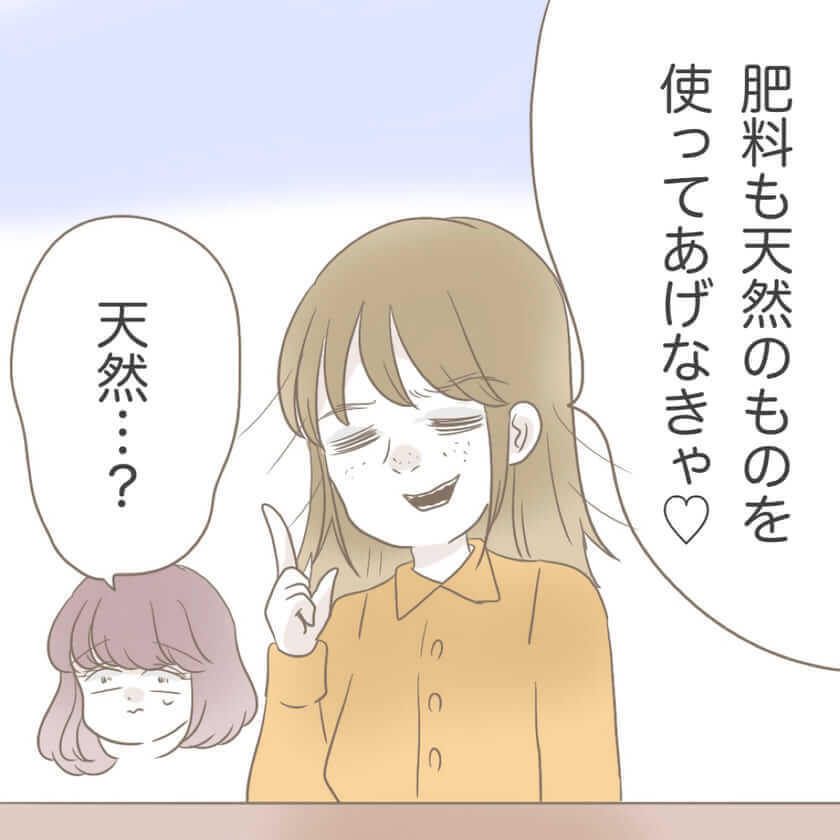 「本当は私たちの生活、真似したいんでしょ?」と、どこまでもポジティブな自然派ママ・土屋さん 。家庭菜園の肥料には「天然のもの」を使っていると自慢げに話しますが、その正体を聞いてアオイさんは絶句します。