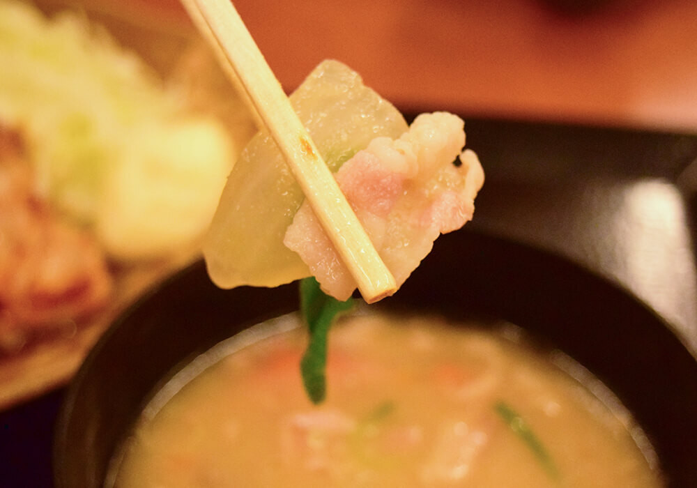 セット内容は、しょうが焼き・ごはん・とん汁。これまで数多くの飲食チェーン店のモーニングメニューを食べてきましたが、汁物は簡易的な「みそ汁」であることがほとんどです。そのため、モーニングで「とん汁」が付いてくるのは、かなり珍しく、印象的だと感じました。
