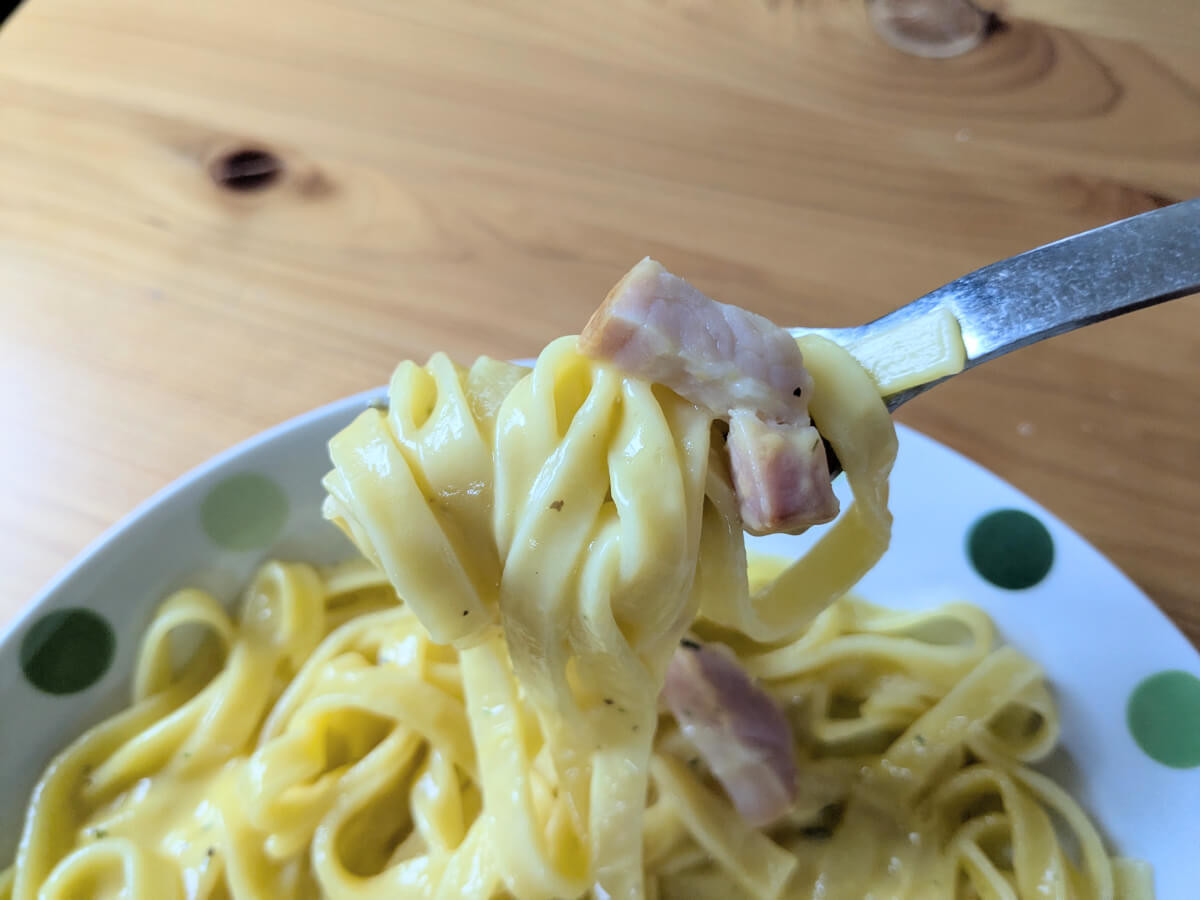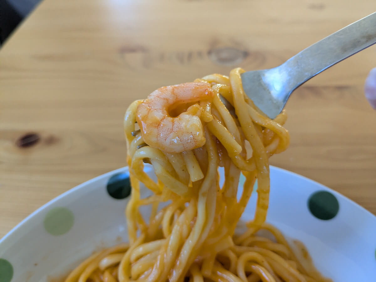 ただ安いだけでなく、カルボナーラには「フェットチーネ」、海老トマトクリームには「リングイーネ」といった本格的な平打ち麺を合わせており、レンジでチンするだけでソースがしっかり絡むもちもち食感を楽しめます。