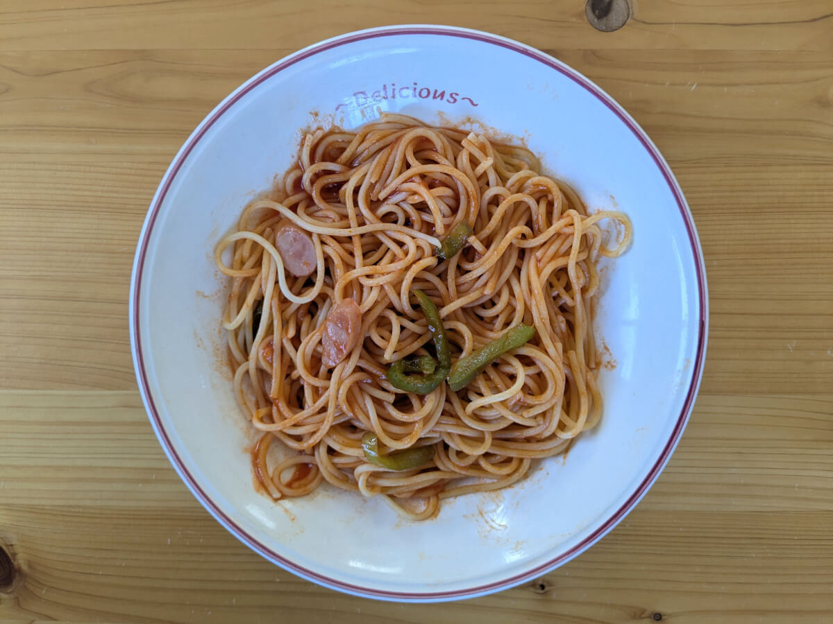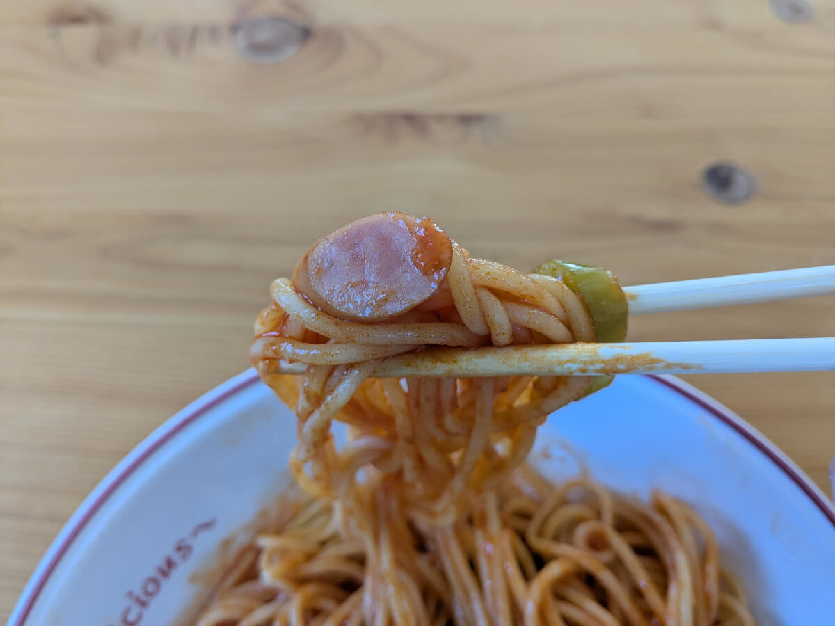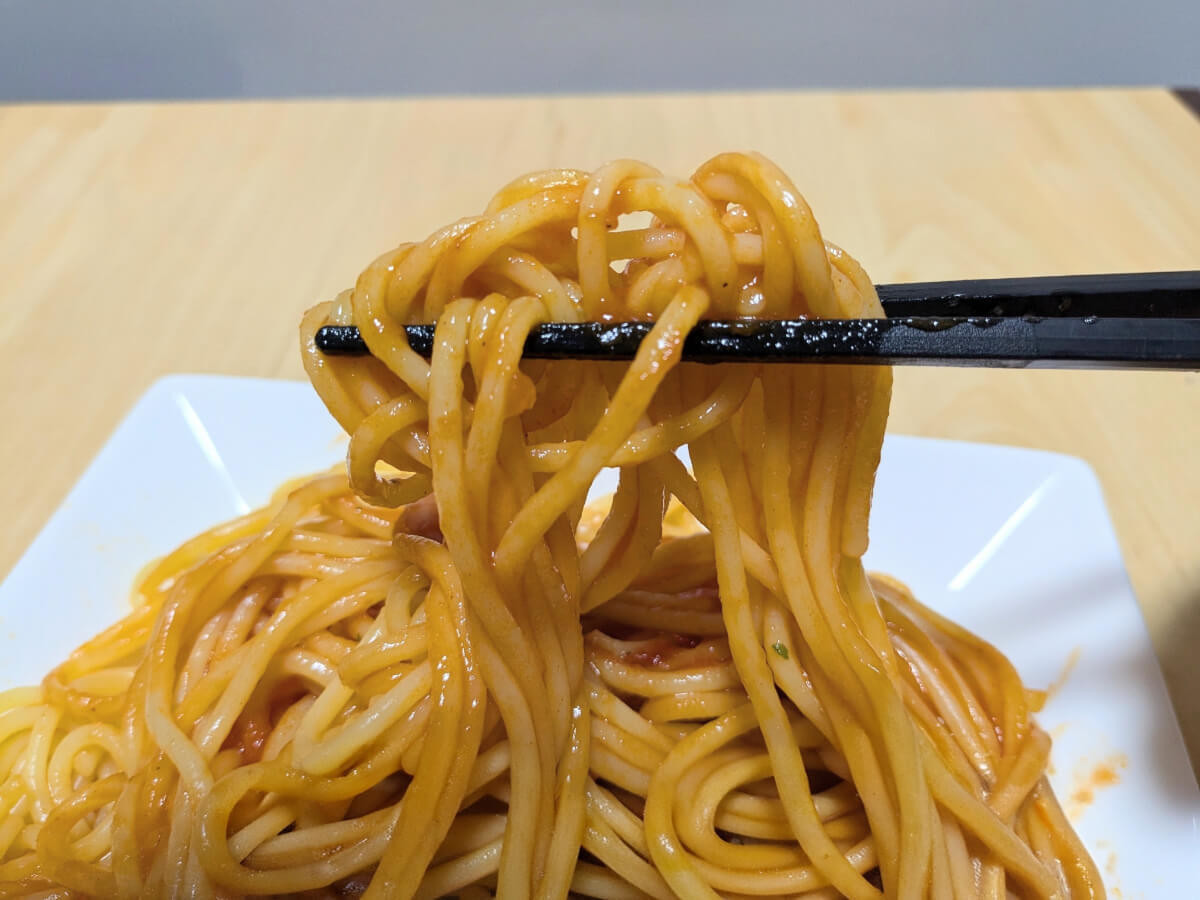 ママーのナポリタンは麺がやわらかめで、トマトの主張をしっかりと感じる味わい。一方、トライアルのナポリタンは酸味が控えめで、よりパンチのある仕上がりです。