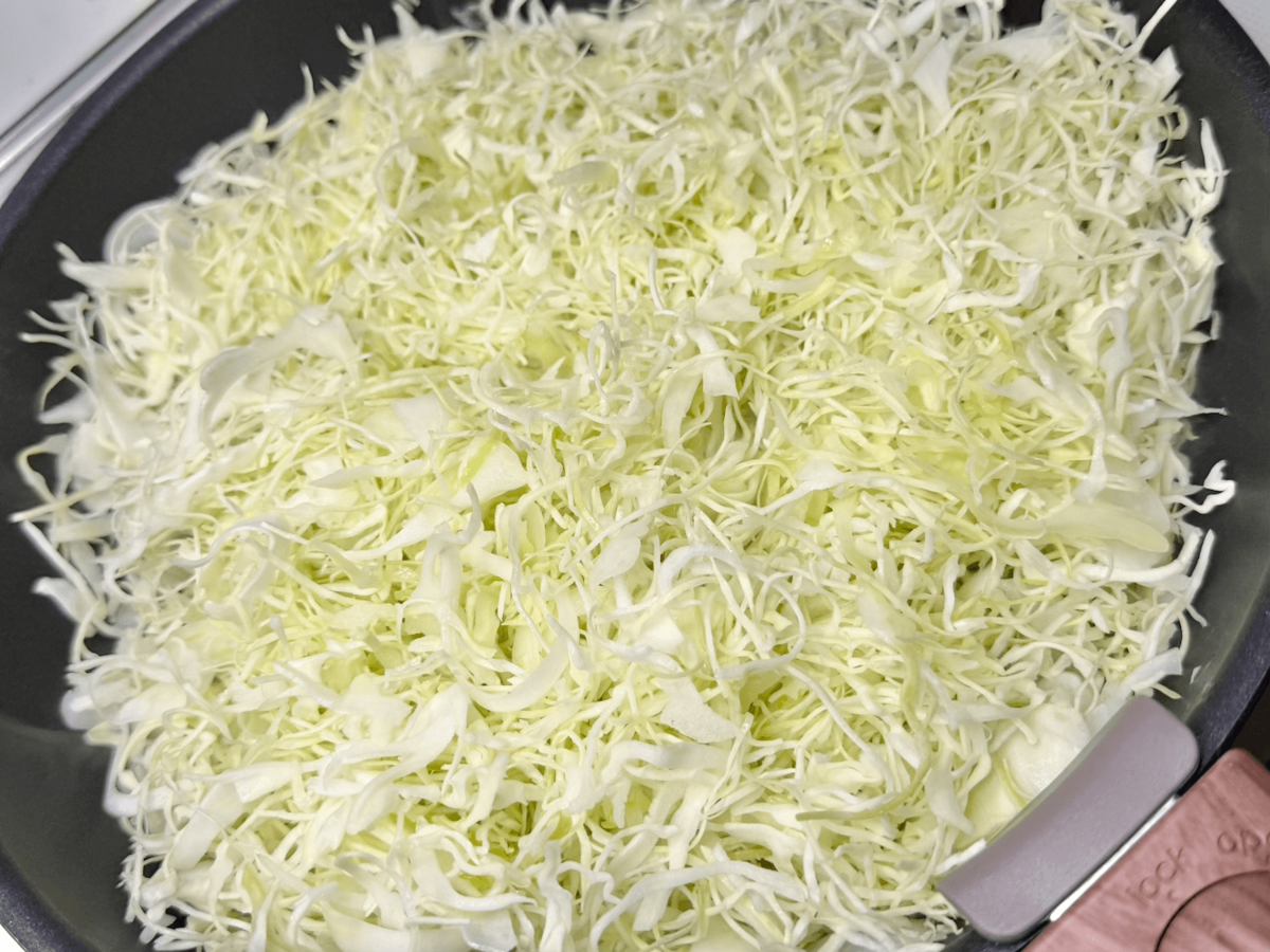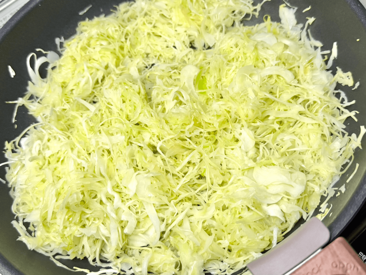 フライパンに千切りキャベツを入れて炒めます。