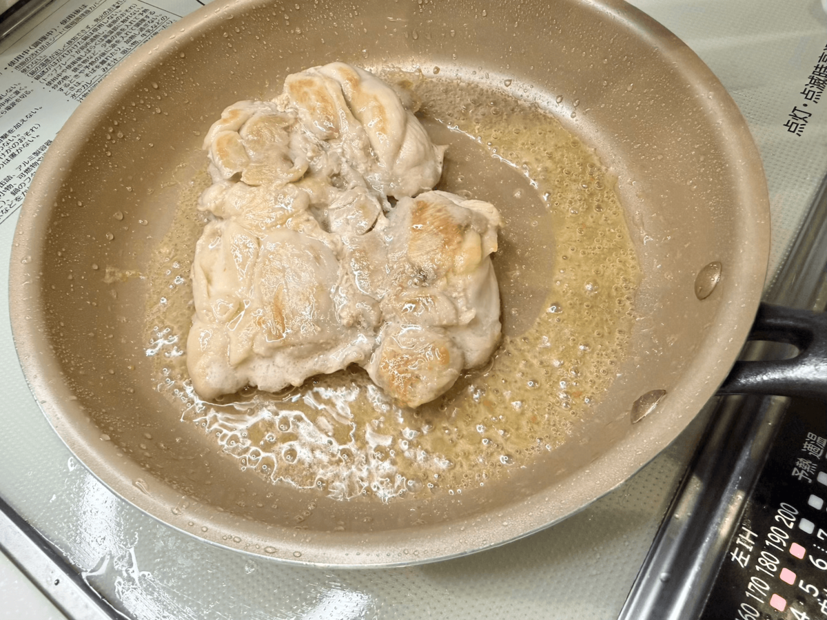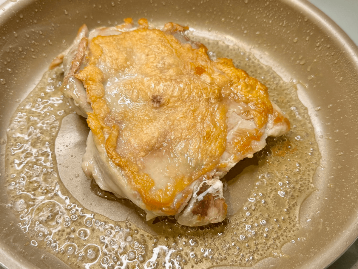この焼き方で、鶏もも肉は均一に焼き色がつき、パリパリ食感に