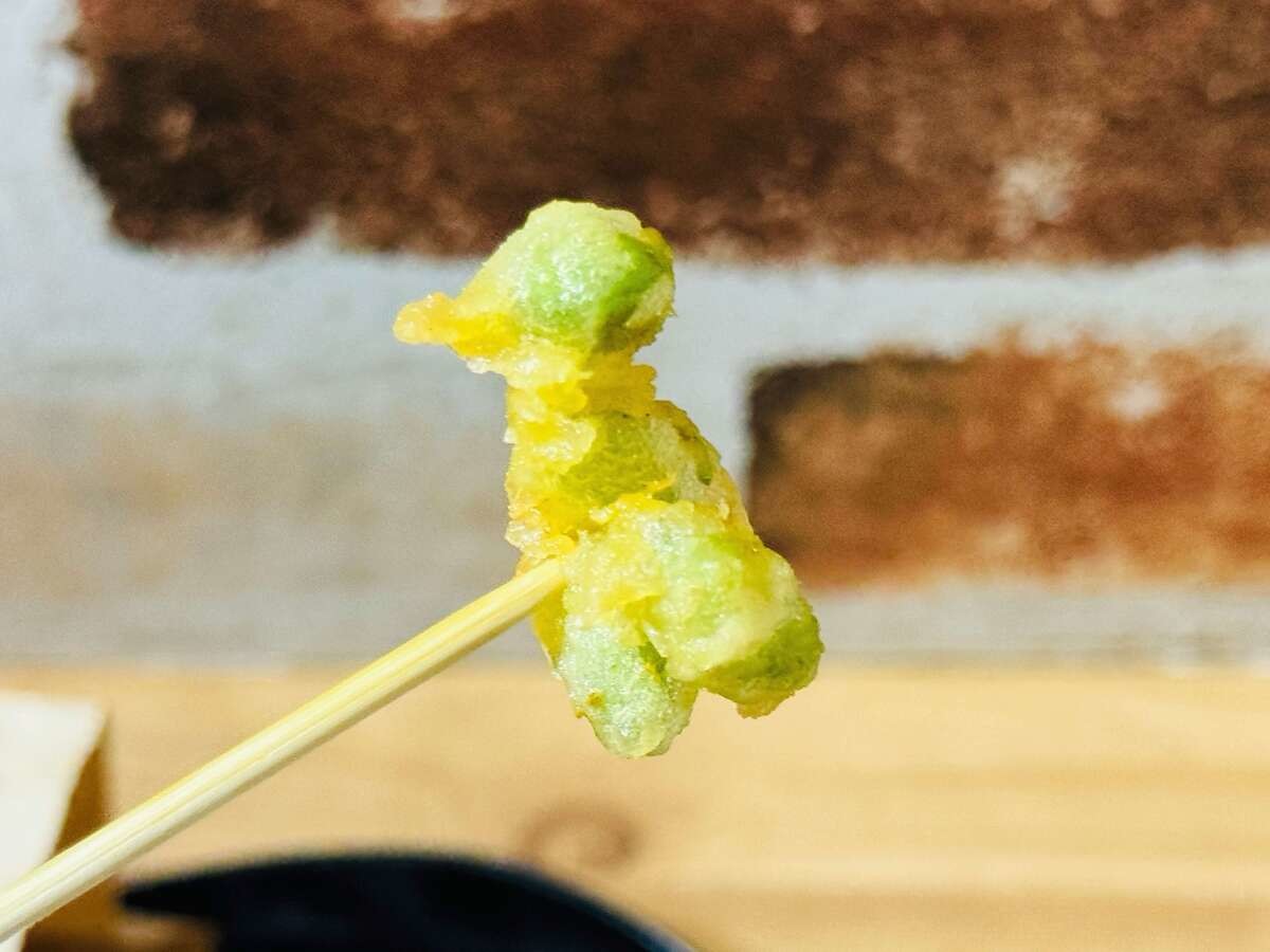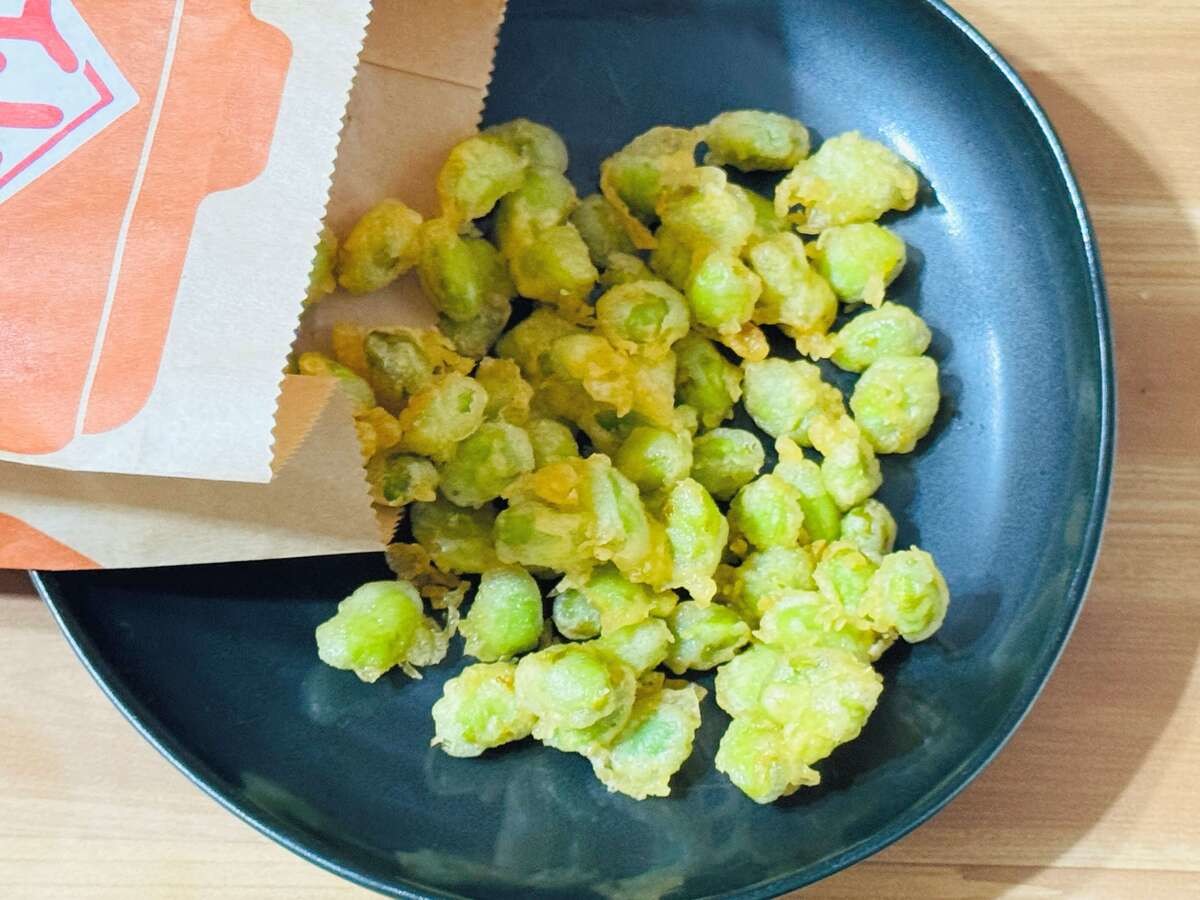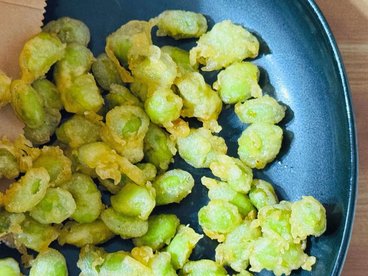 購入後、自宅に持ち帰るまでに約40分ほどでお皿に出してみると、まとまっているものもありますが、基本的に枝豆1つずつを天ぷらにしているようですね。