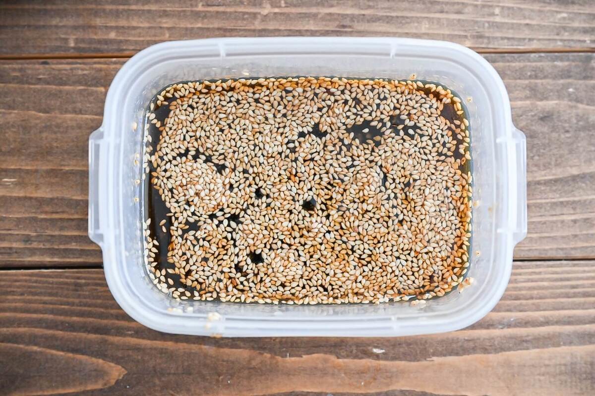ポン酢しょうゆ、加熱したみりん、にんにく、しょうが、白いりごま、ごま油、水50mlを保存容器に入れて混ぜ合わせます。