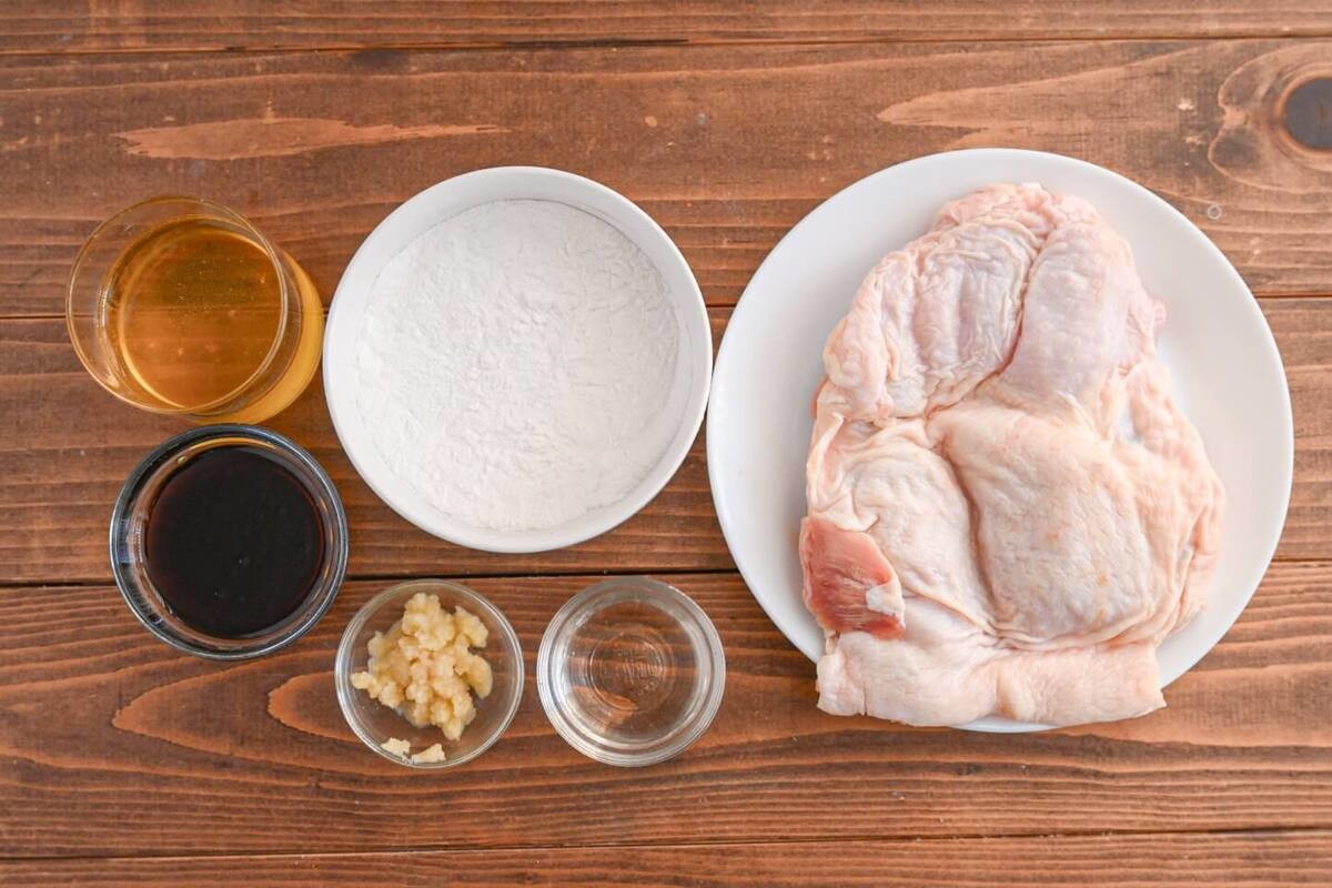 鶏もも肉にすりおろししょうが、酒、しょうゆを揉み込みます。