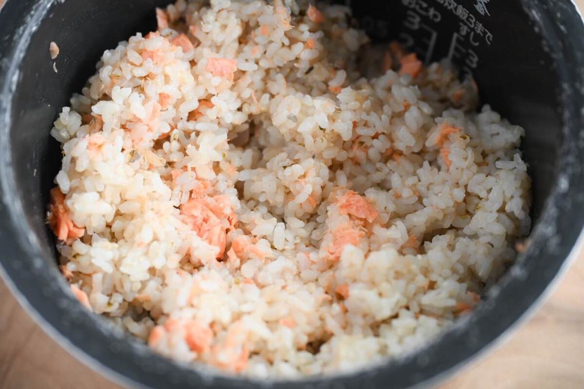 炊飯が終わったら、塩鮭の骨を取り除き、しゃもじで全体をやさしく混ぜます。