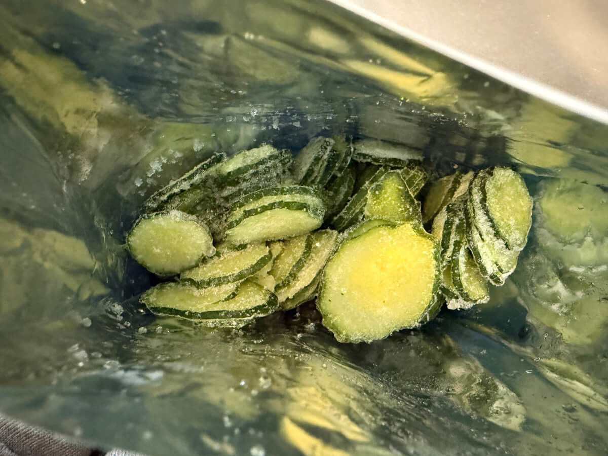 解凍後のきゅうりは、生野菜のシャキシャキ感とは違い、塩揉みした後のようなしんなりとした食感になります。