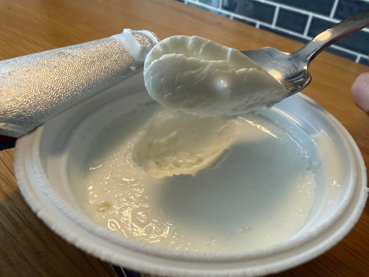 開けてみるとどっしりとした濃厚な質感。口に入れるとなめらかでクリーミーで食べやすいです。 プレーンなので甘さはなく、大人はそのままや蜂蜜をかけて楽しんでいます。