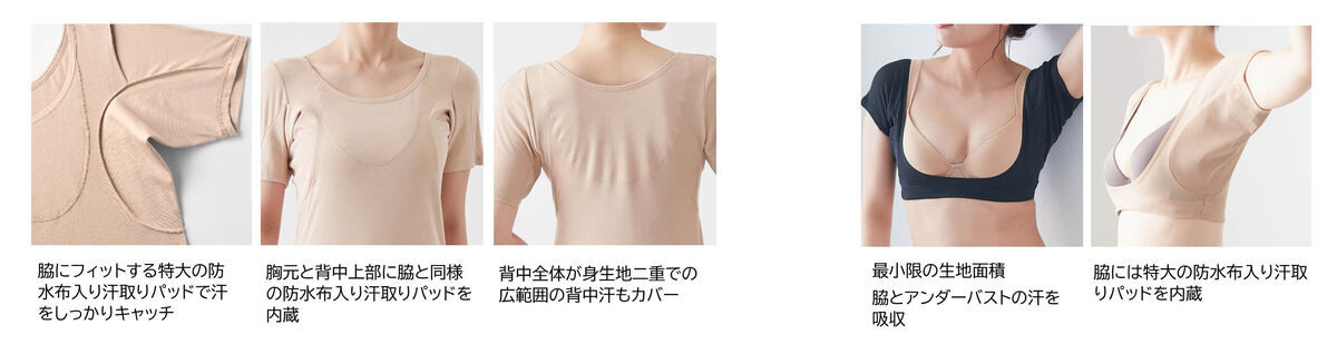 「綿混ショート丈フレンチスリーブ(大汗さん)」(右)は、最小限の生地面積で涼しさと大汗対策を両立したインナーです。汗の悩みの種類やお好みの着心地に合わせて選ぶことができる2つの新商品です。