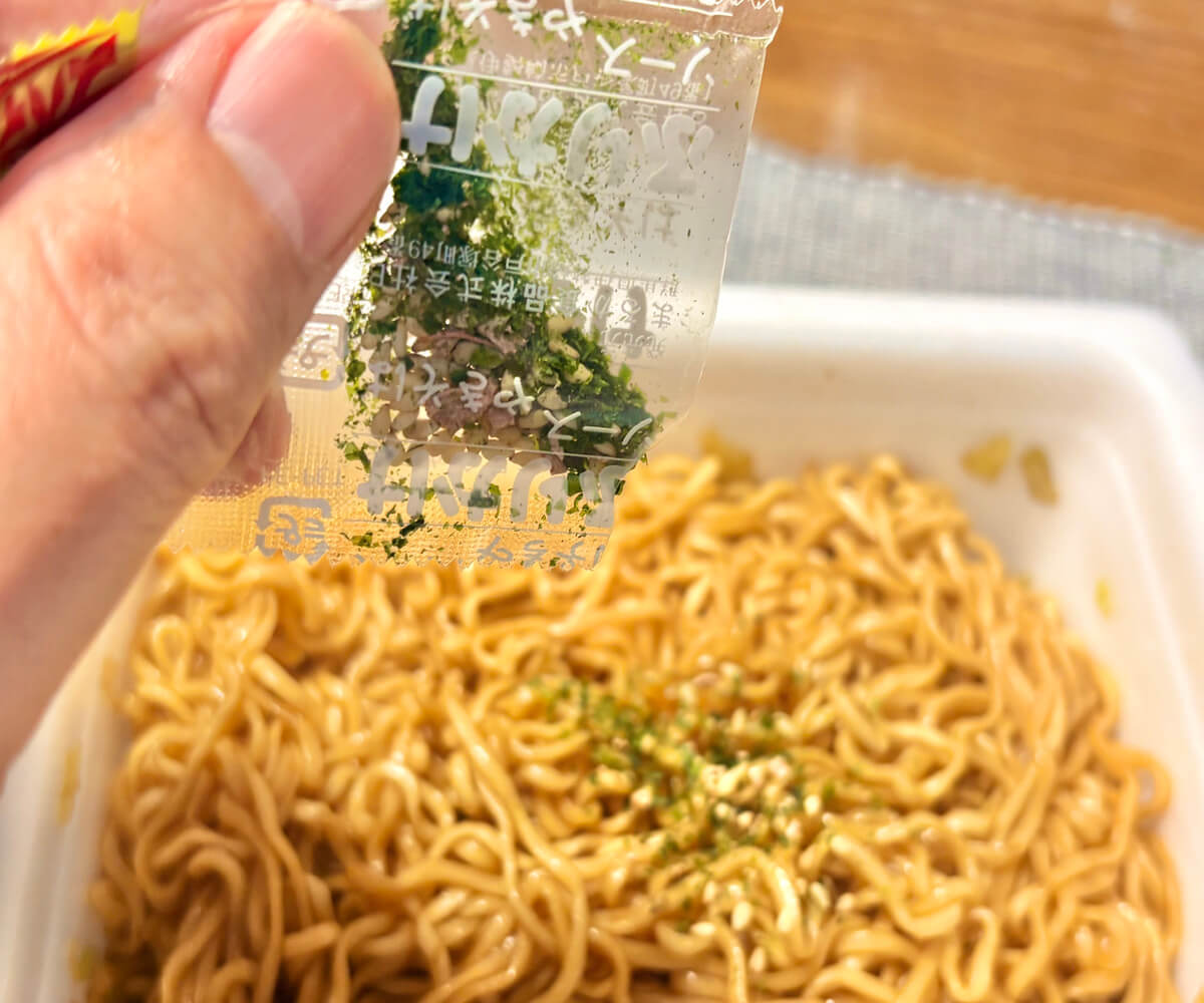 かやくの袋を開け、麺の上にかけていきます。