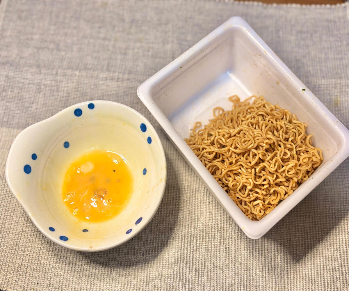 普通にペヤングを作って溶き卵につけて食べるだけ