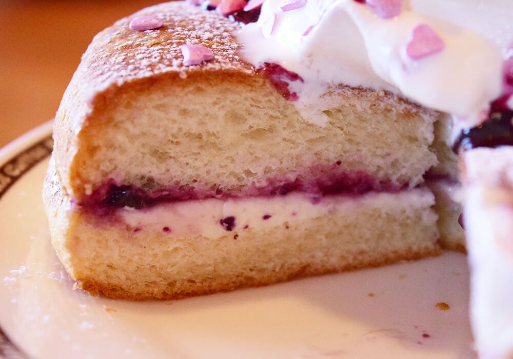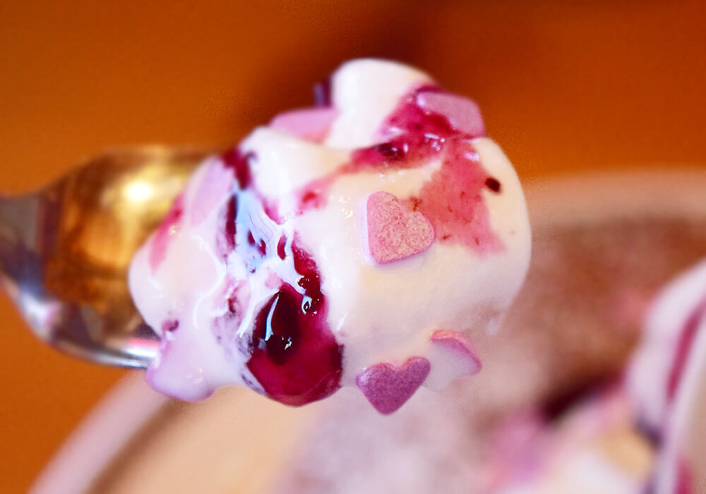 ブルーベリーソースは甘酸っぱさがありつつも、良い意味でクセが強くありません。ガリガリとした食感のハートシュガーも、甘ったるさがないため味の邪魔にはなっていません。