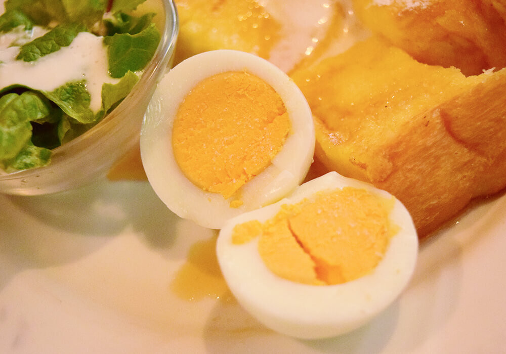 ゆで卵は黄身がしっかり固まった仕上がりです。サラダと一緒に楽しむのはもちろん、フレンチトーストの上にのせて食べても美味しいですよ。