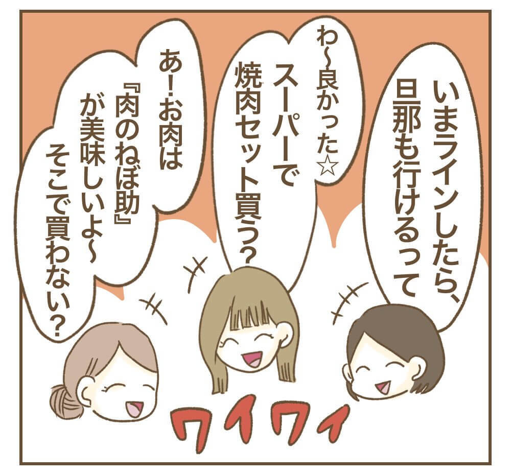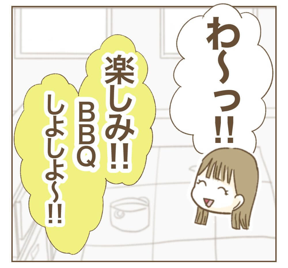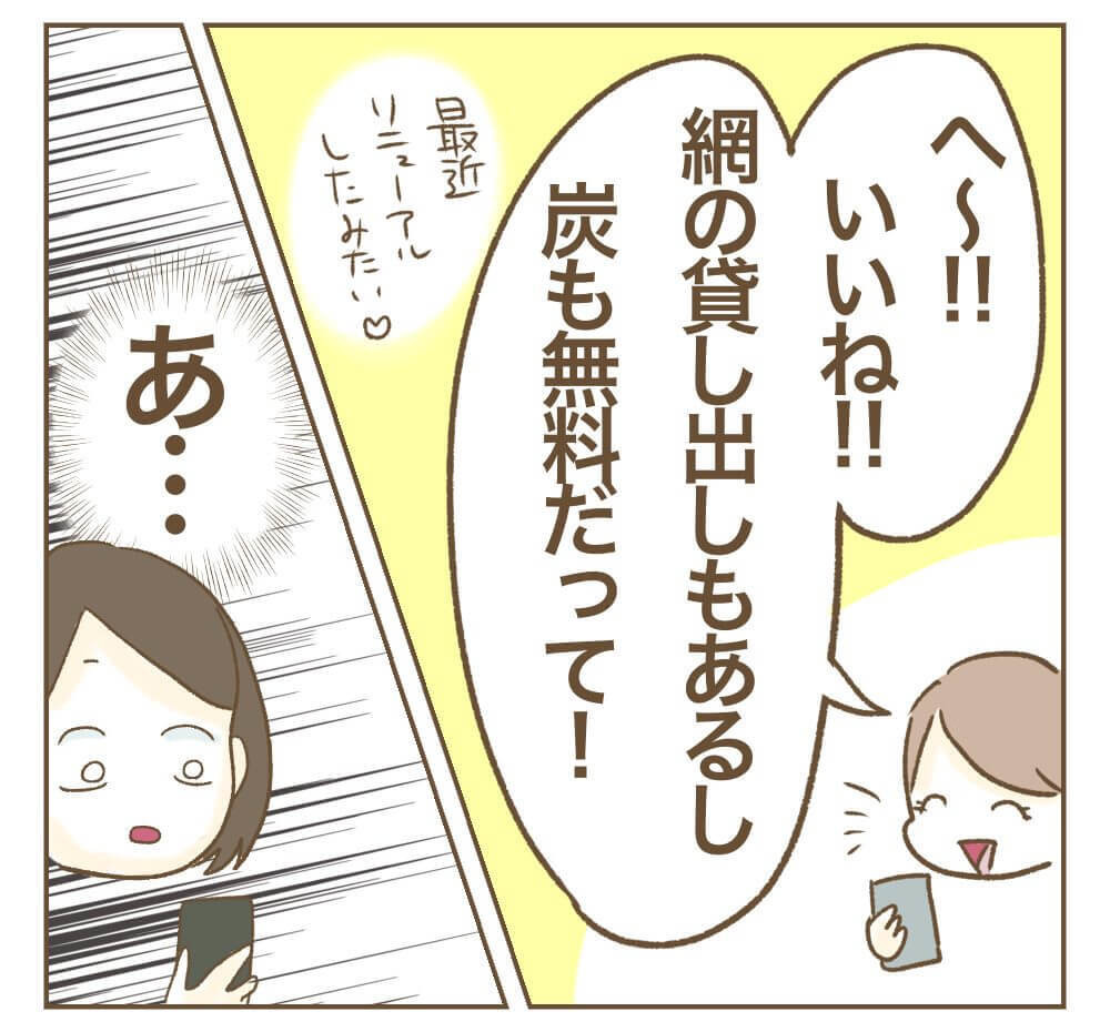 場所は、自宅から少し離れた有料のBBQ場に決定しました。利用料はかかってしまいますが、設備も整った楽しそうな雰囲気に、ミオさんも参加を決めます。その場で旦那さんたちに連絡を取ると、全員がスケジュールを合わせてくれることになり、一同は大盛り上がり!
